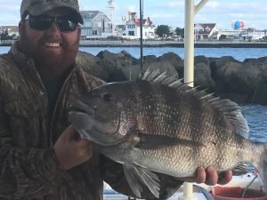 There has been a pretty incredible run of sheepshead in the Ocean City inlet over the past few weeks. There is currently no realistic creel limit for sheepshead in Maryland, but I think there may be one on the horizon…there should be. The best baits right now are sand fleas and green crabs and fish are being caught on the north and south jetty. Captain Jason Mumford of Lucky Break Charters was fishing the inlet this morning and found himself a big 12.2 pound sheepshead while fishing a green crab.