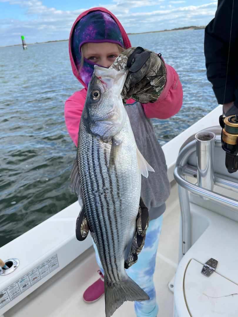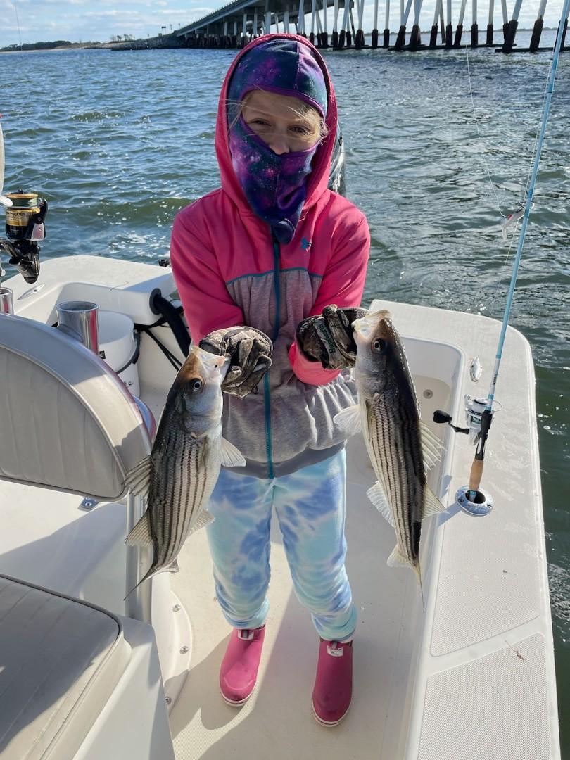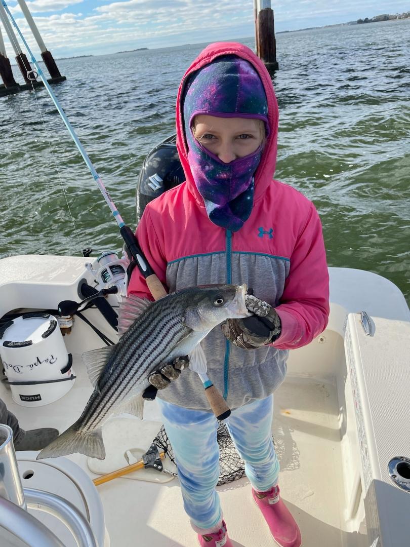My buddy Mike G has been hitting the bay this week having some reel fun with the school sized rockfish and he and his crew have been releasing a bunch of fish.  The other day Mike and Chris Brackens released several short, but fat fish at the Verrazano bridge behind Assateague Island and today he and his Goddaughter Brooklyn Brady of Berlin did some more of the same in the cold, windy conditions.  They were able to find some clean water and the right tide and even though it was cold the little trooper refused to leave because they were catching so many fish.