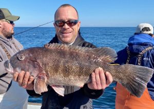 He’d walked forward and dropped by the anchor winch – man what a fight. Will get a good weight dockside. I considered the fish too exhausted for a release candidate. At sea the 29.75 inch tog bounced the scale from 18 to 20lb 8oz.