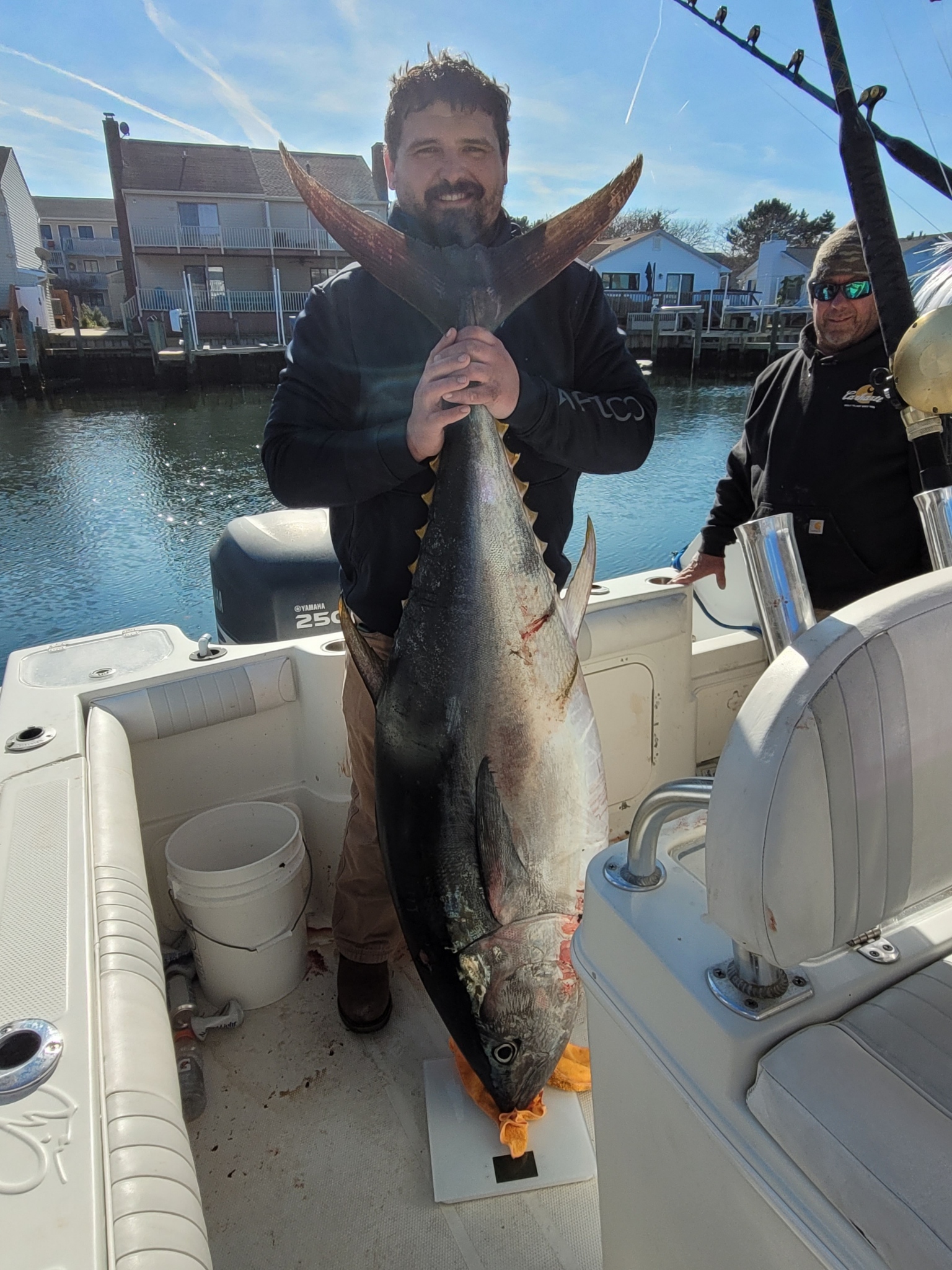 Captain Dave Caffrey and the crew of On the Run paddled off to the bluefin grounds today where they put two fish in the boat of 46″ and 59 pounds, and 68″ and 181 pounds.