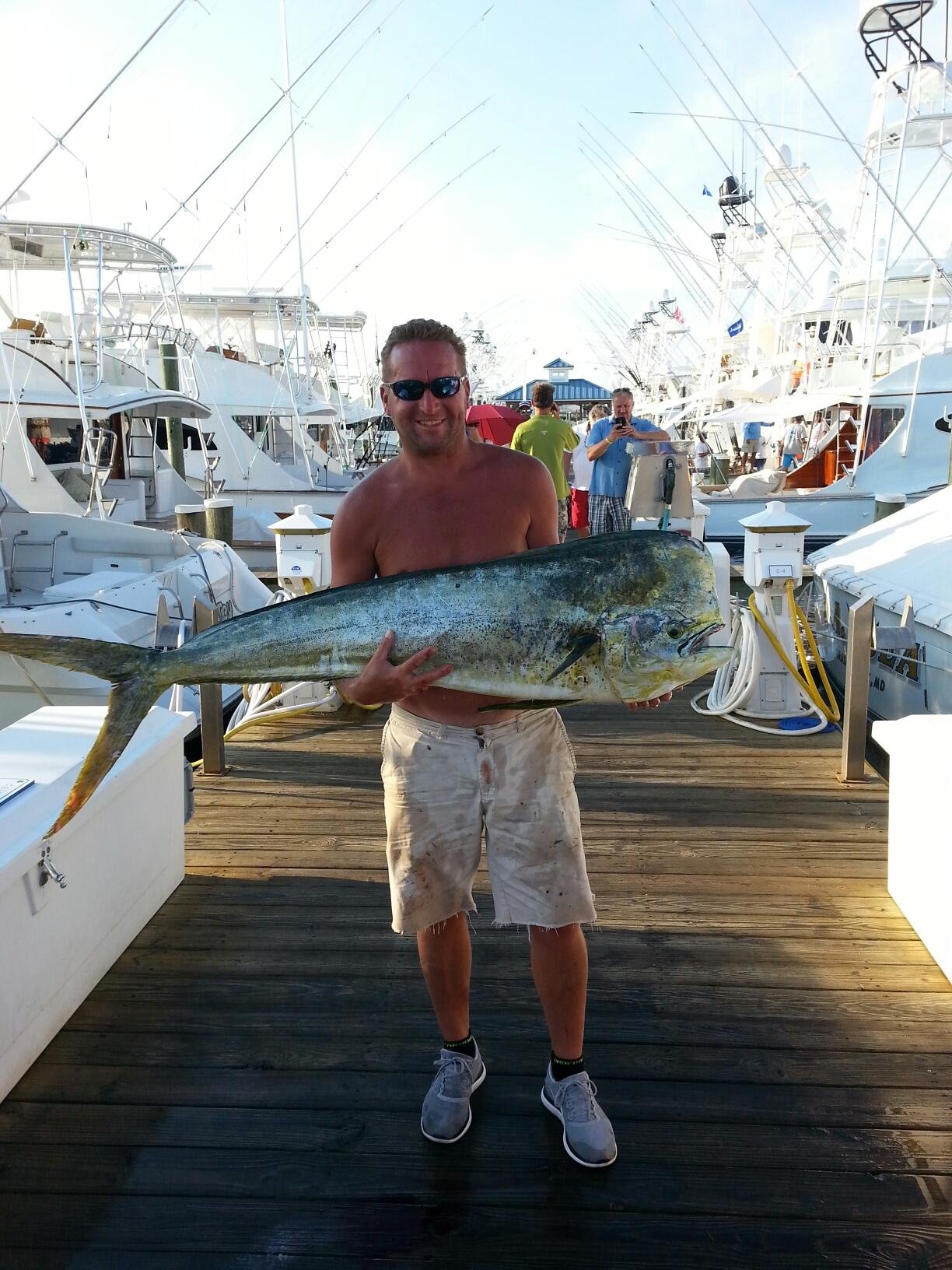 David Bradley owner of the Sea Prowler was kind enough to let me run his boat for the 2015 Big Fish Classic. Departed OCMD inlet at 330am on Friday July 24th with 300 pounds of ice, 150 ballyhoos, 4 flats of butterfish, and some eager fishermen. Lines in at 7 am. Started in the tip of the Washington and worked the area. First bite came at 10:29 am and resulted in 42lb wahoo. Around noon we started on the chunk. Hooked 14 yellowfins and sharks got all but 1 which was 49.5lbs. Big eye came screaming into the chunks toss him a large squid and the fight was on. 45 min later he chaffed off. Also released 3 brown sharks during the day. Set up for the evening troll and saw 2 white marlin. At 10:34 pm the long rigger snapped out of the clip but did not come tight I ran down from the bridge dropped it back approx. 25 ft and jigged the bait twice. The line started to peel off so fast it burned my finger. I put the drag to strike and at 18lbs of drag the fish dumped my 80 to half spool. Drag went to 24lbs where it stayed the next 2.5 hours. The bite came on the long rigger on a 1 oz joe shute crystal with a trolled ballyhoo and a 12/0 circle hook. Josh Ensor battled the fish the entire time dealing with massive head shakes and the fish wanting to stick to the bottom. The fish came up beside the boat and was gaffed without incident. Fish hit the deck and I think you guys on land heard us yell and celebrate. Not only was it a swordfish, it was a fat one. I ended up having to cut the side out of the backup fish bag in order to make sure our catch was properly iced. Ran to my chunk spot and started the night chunk. Tons of life but no tunas in the dark. At 230am we started catching the sharks and released another 2. But the second one caught at 4 am got back at us. Jason’s hand was on the side of the boat when the shark made a run towards the bow. The wire took the greater part of the tip of his finger off like it was hot butter. Shark was released safely and then we had to do offshore surgery. With a basic medical kit Mike did the best he could to doctor Jason up. With Jason loosing feeling in his hand and the risk of infection I decided to terminate the trip and get him to a hospital. I used the Sat phone to arrange a ride to the hospital for Jason. We dropped Jason off at Sunset marina at 7am. Got fuel and ice and returned the deep, started back fishing at 930am. Caught 5 10-15lb mahi on the day troll. Lines out at 3pm. Great 26 kt ride home seeing flying fish and turtles all the way to 8 fathoms. While we were trolling during the day Jason was in Salisbury getting surgery on this hand. He was in recovery till 2 pm. I picked Jason back up at sunset marina at 4pm and he rode to the scales with us sling and all. We weighed the sword fish at a whopping 197 pounds. Next the yellowfin and wahoo. Stringer weight of 290lbs.  Great trip full of twists. Another great trip with 37 hours at sea.