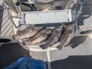 Blake Gunther and Nick Michael found some spots out of the wind today and had a crazy good day of tautog fishing at the south jetty and Martha’s Landing. Blake and Nick used Deadly Tackle tog / bottom jigs to trick up a limit of two tautog each over 16″, threw back three fish that would have been keepers and another 50 short fish. That’s some awesome fishing! Remember, tautog regulations change to 4 fish per person at 16″ starting tomorrow through May 15, 2025.