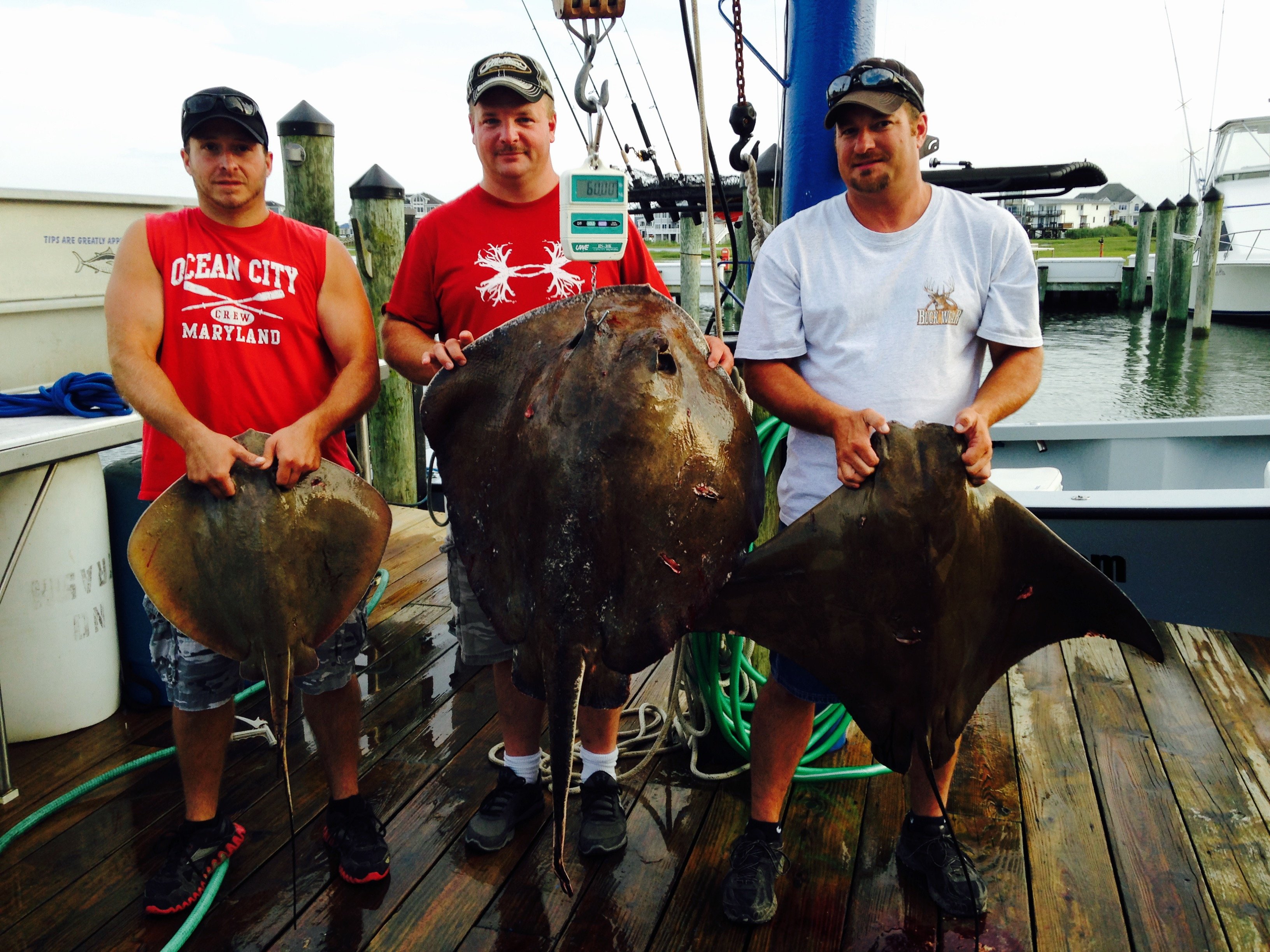 Inshore, Captain John Prather on the Ocean City Guide Service out of The Ocean City Fishing Center had two great trips today, both of them completely different. First up was an awesome morning trip of bow fishing rays…