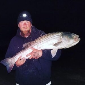 There have been a few keeper rockfish being caught in the surf recently which is a good sign for beach fishermen.  David Moore caught this beauty of a 45″ rockfish over the weekend on cut bunker from the dirt on Assateague Island.  David fished late and hooked the fish at around 2 am.