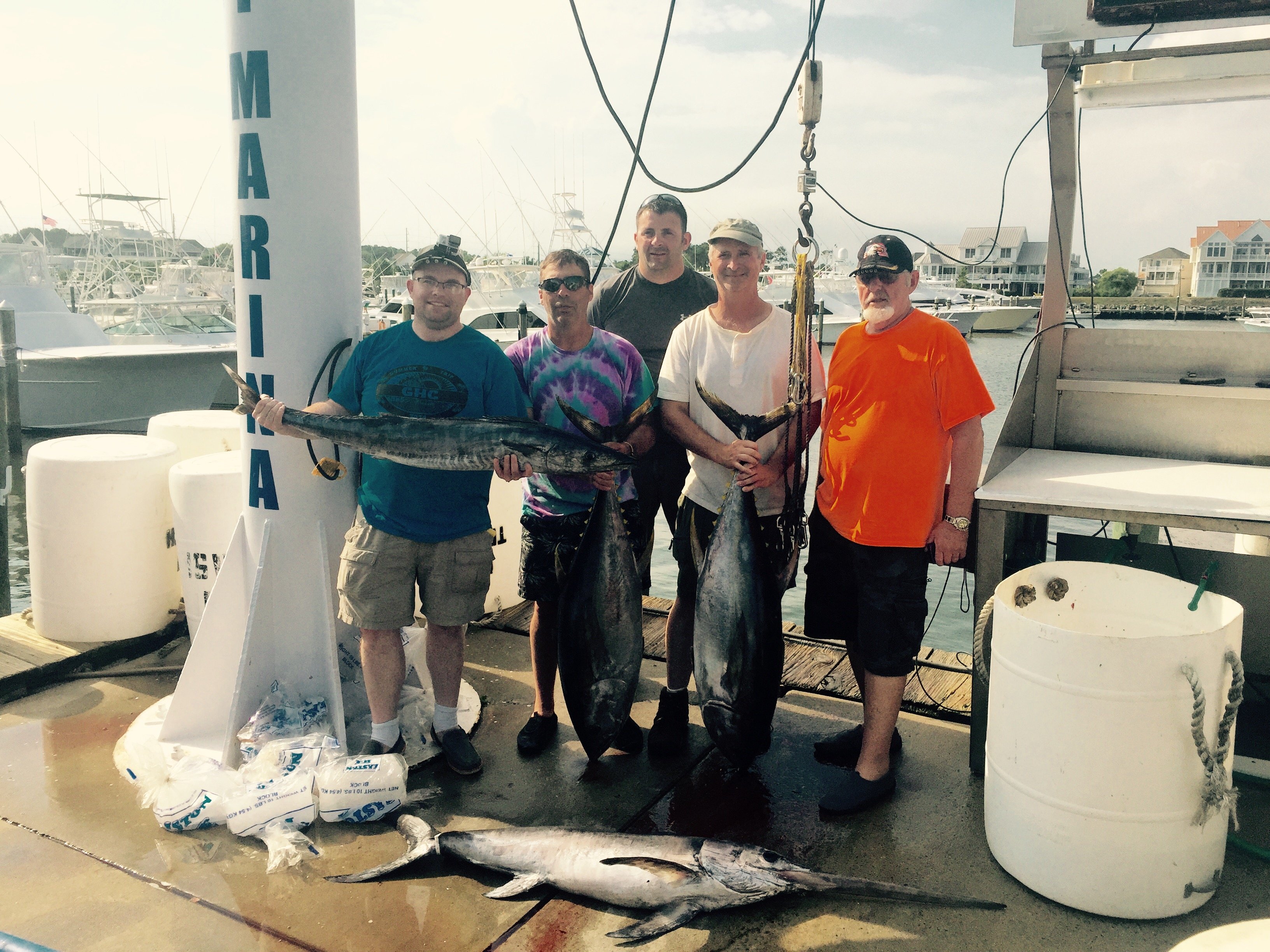 Captain Rob Skillman on board the Moore Bills out of The Ocean City Fishing Center had a great day in the canyons. Here is his crew with a 128 pound bigeye, four yellowfin and a white marlin release.