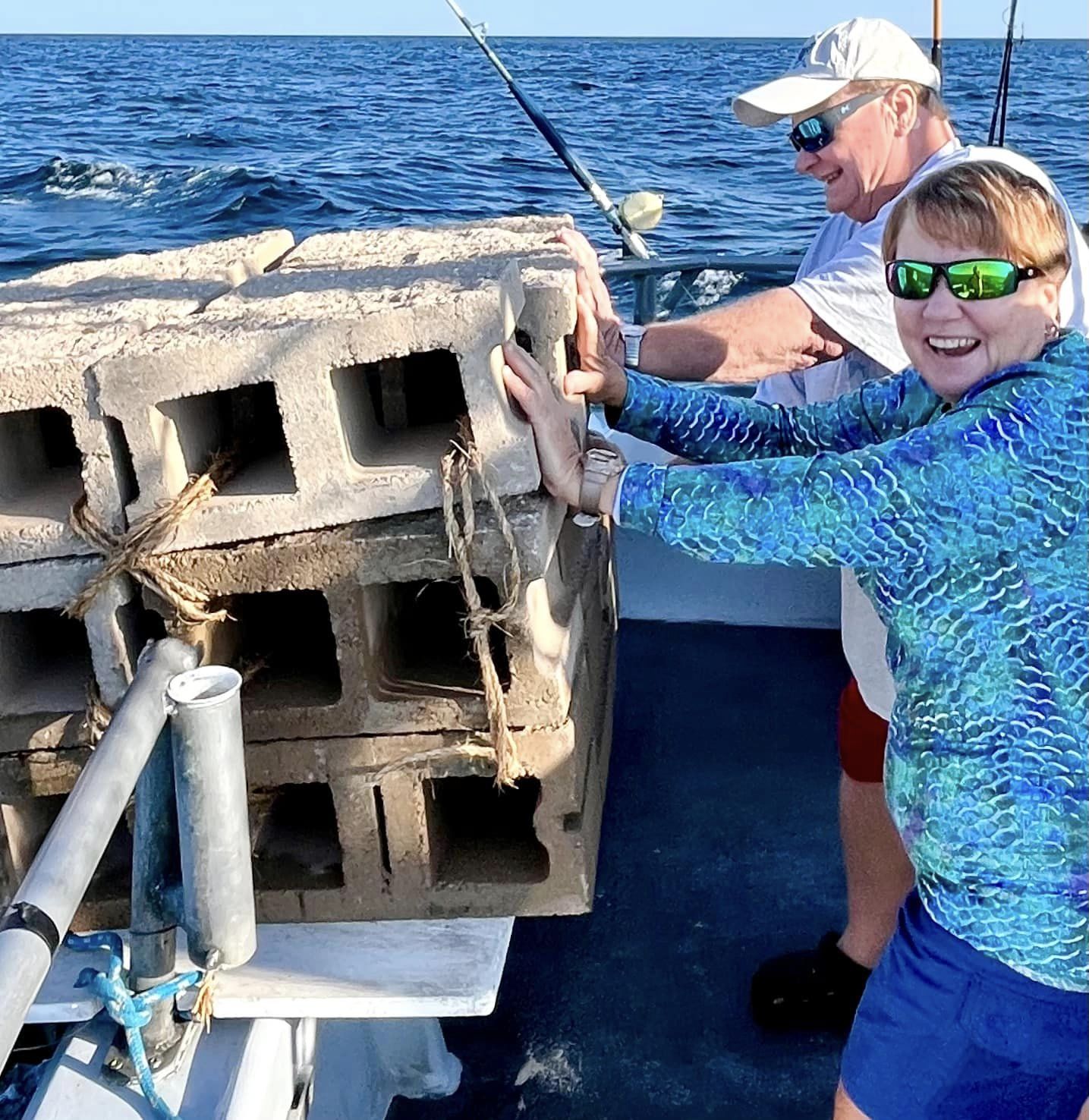 Though we had no bamboo to add to a unit, I headed to the experimental reef we’re building off the stern of my boat for today’s 24 reef-block drop. Ms Holly and Hurricane made short work of it (and, yes, I had mate Joe check Hurricane Murray’s ankles for any spiteful act of vengence.)