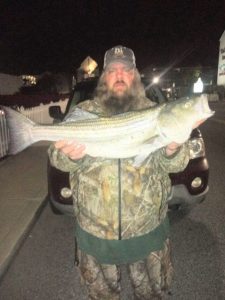 Buddy Martin used a 1 1/2 oz jig and a 5″ paddle tail to land this 33″ keeper rockfish at the route 50 bridge last night.