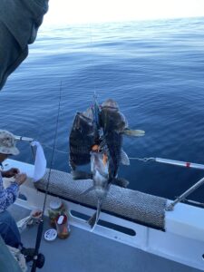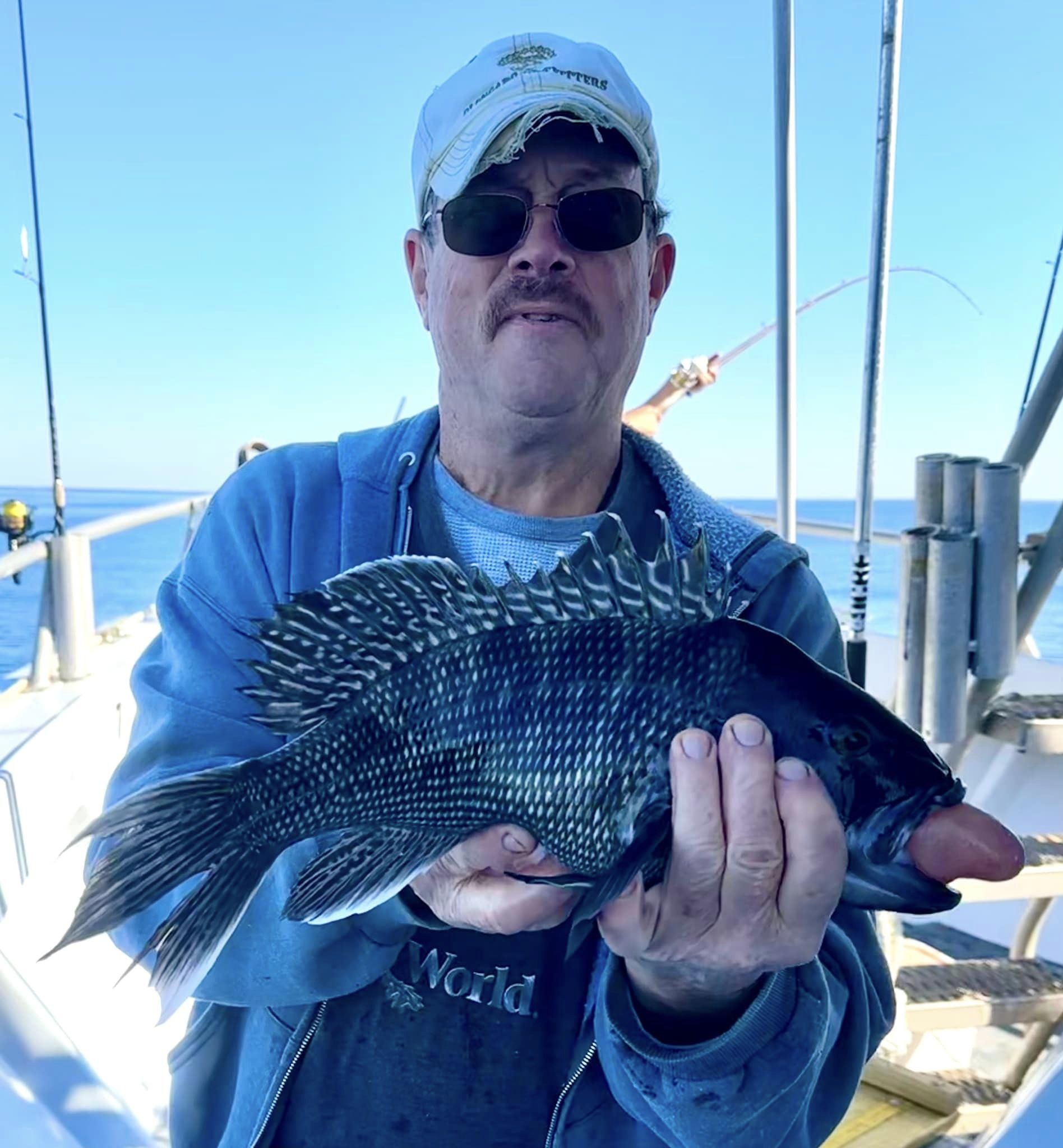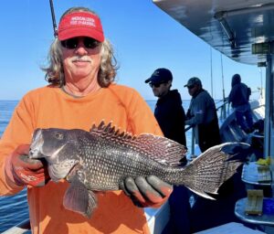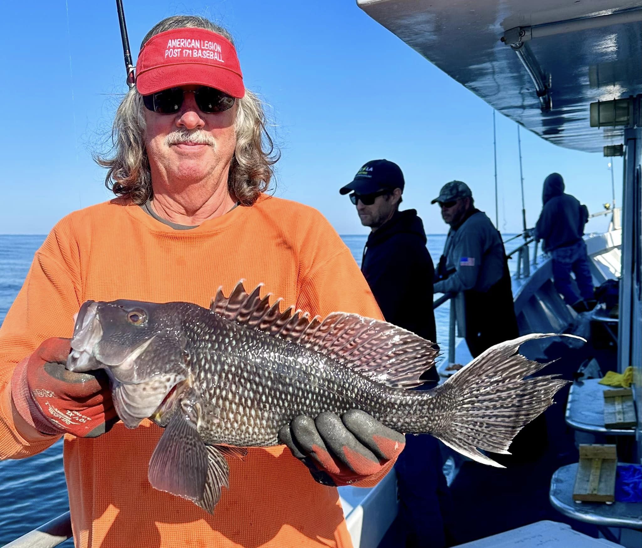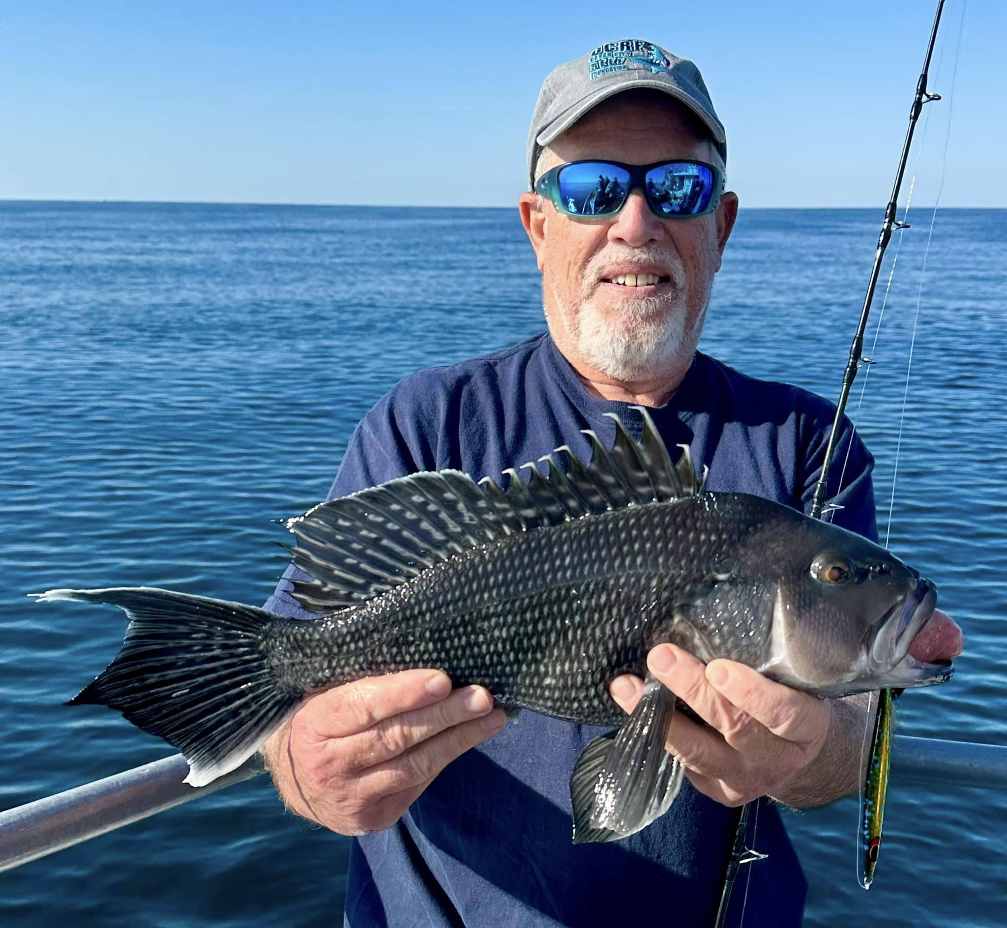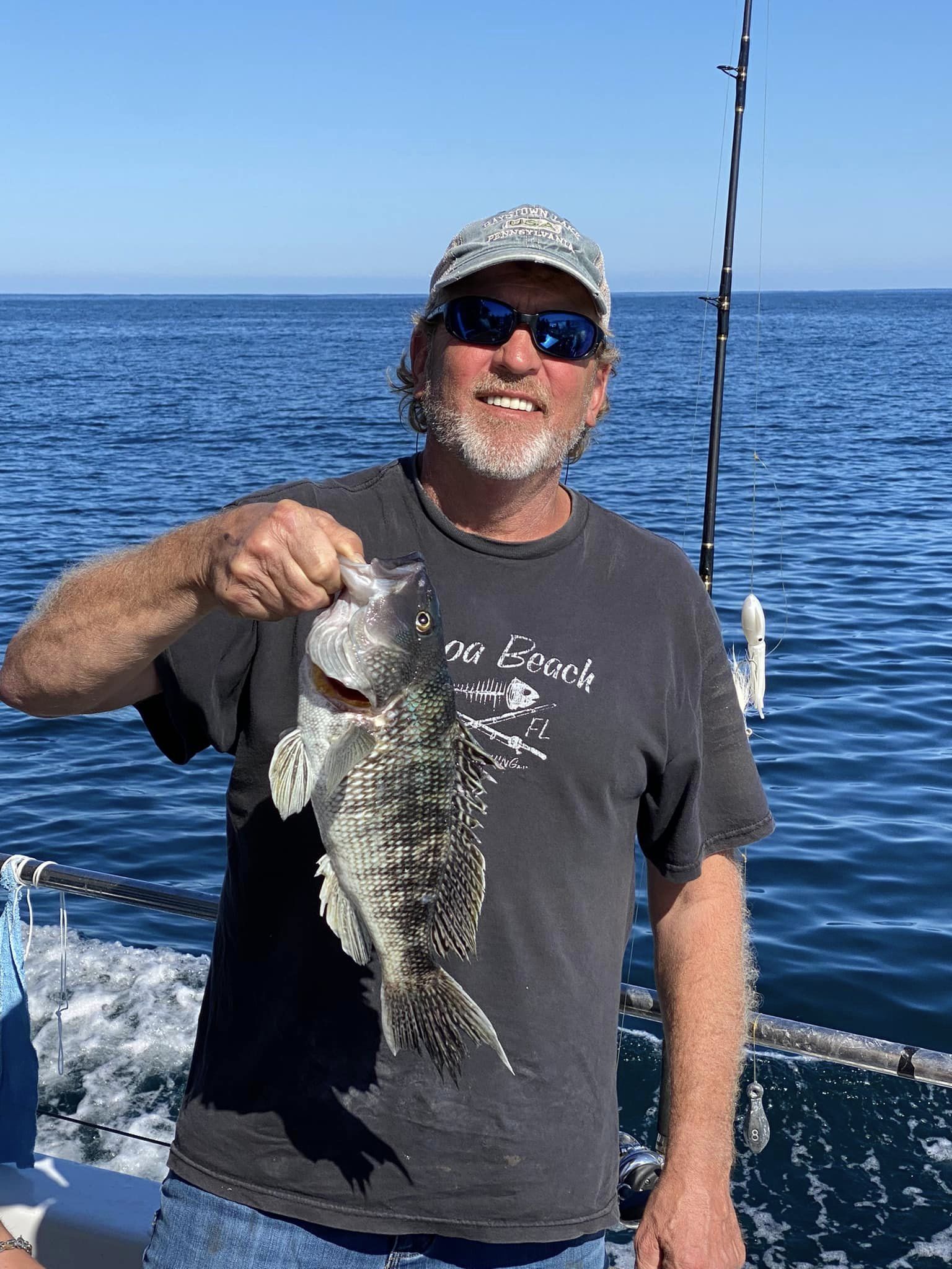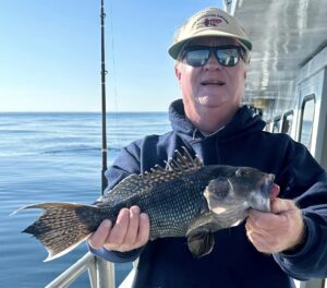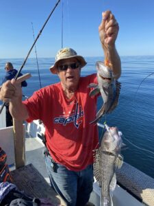 Don Neste came all the way from Hayward, Wisconsin to fish with his son-in-law Steve Hadley and Eric Farrell. The crew had a limit of sea bass, some triggerfish and some bluefish in some beautiful weather. Steve even had a bird take a rest on his head.