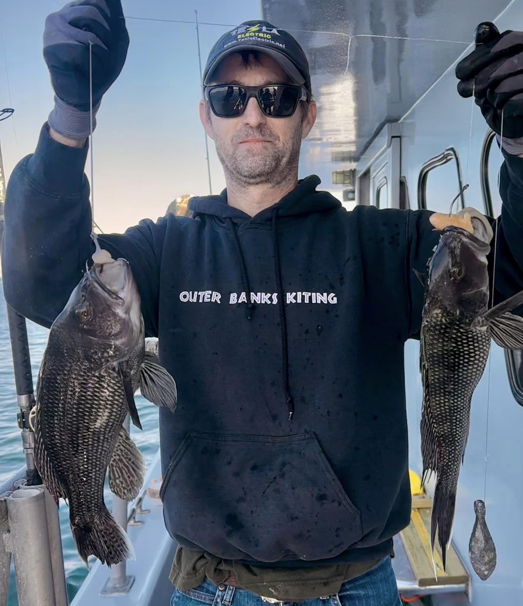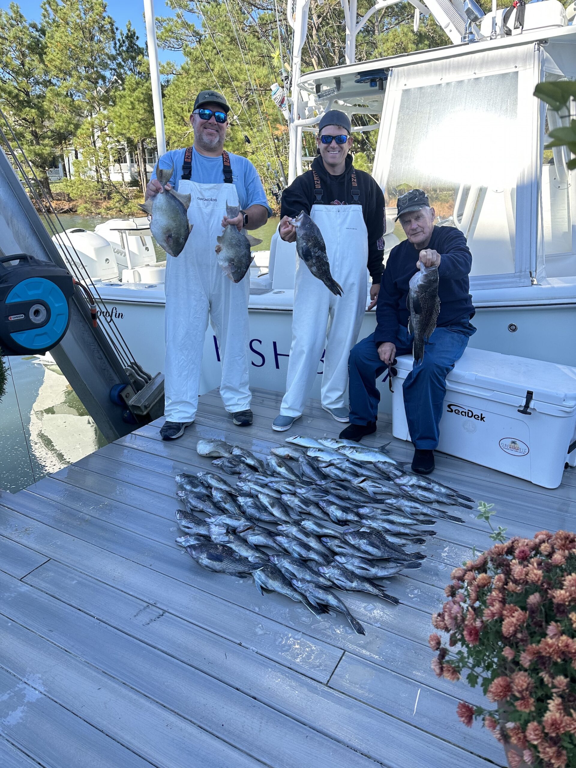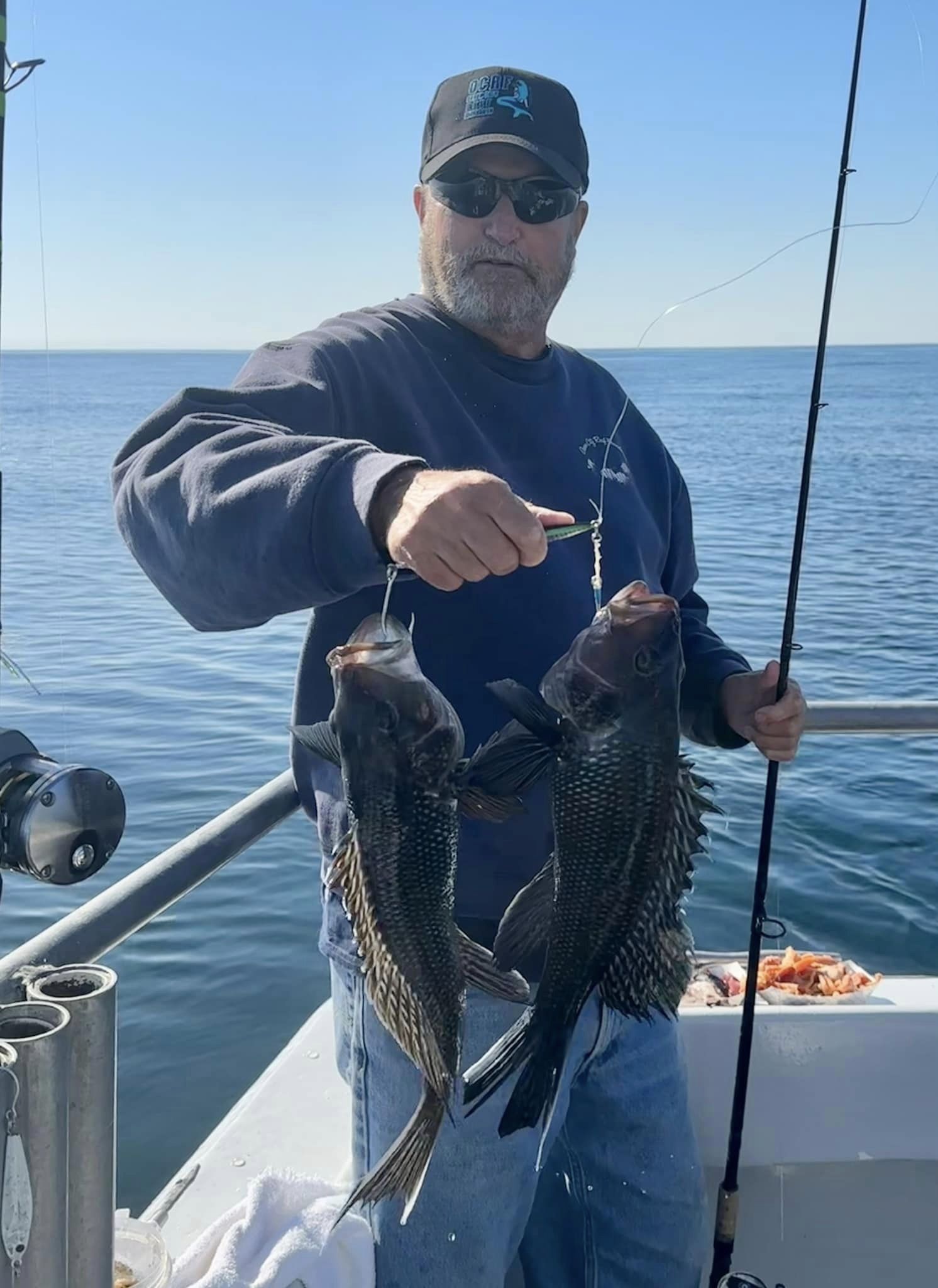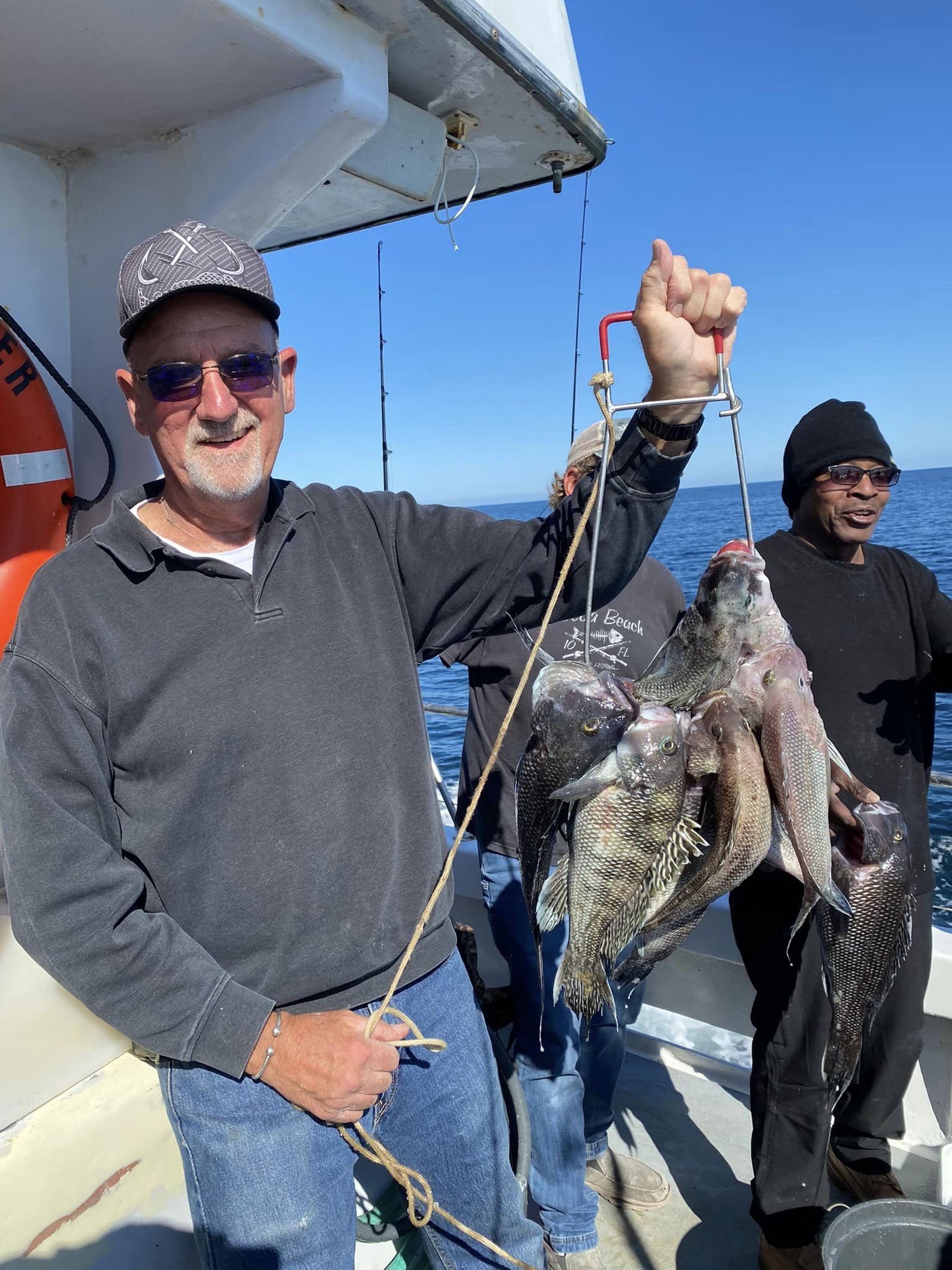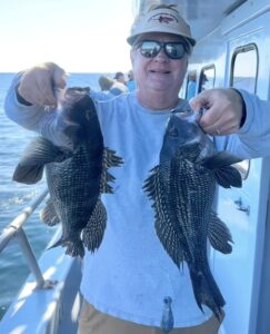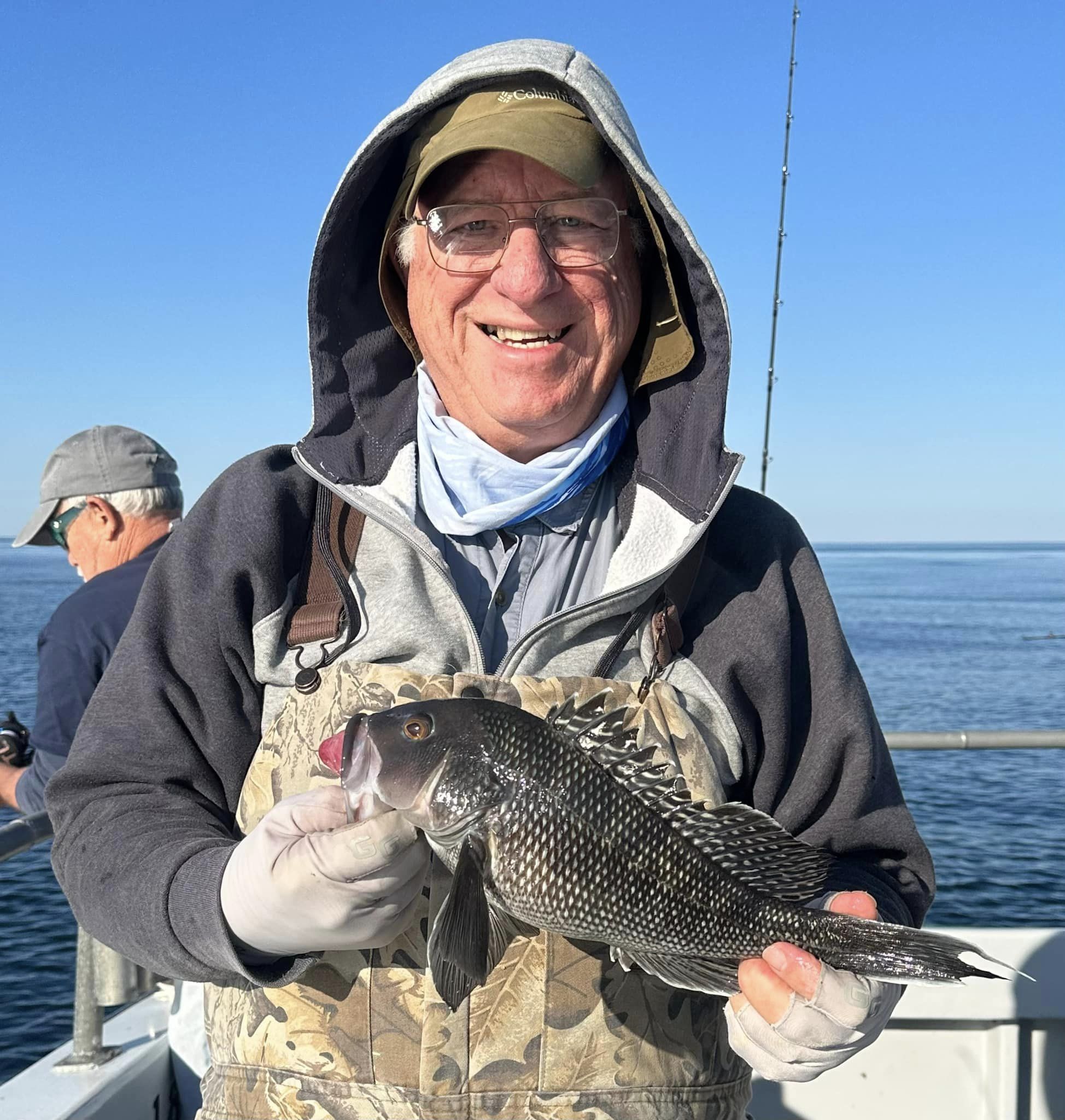 Don Neste came all the way from Hayward, Wisconsin to fish with his son-in-law Steve Hadley and Eric Farrell. The crew had a limit of sea bass, some triggerfish and some bluefish in some beautiful weather. Steve even had a bird take a rest on his head.