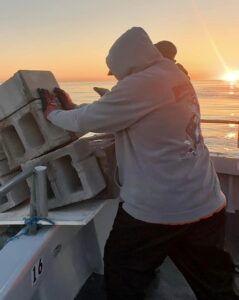 Just a handful of anglers today; most were long time regulars. Cleared the inlet well before dawn and found a wonderfully calm ocean. Charlie & Clinton volunteered for the block drop – 20 more blocks landed in the well of Uncle Murphy’s landing craft at sunrise. (I hope!)