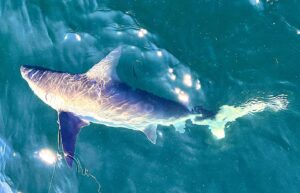Sea Bass Bob snagged a small shark with a big attitude. Hooked in a pec fin with a favorite jig, man in a gray suit ripped a lot of line off several times before the boys popped him off on purpose.