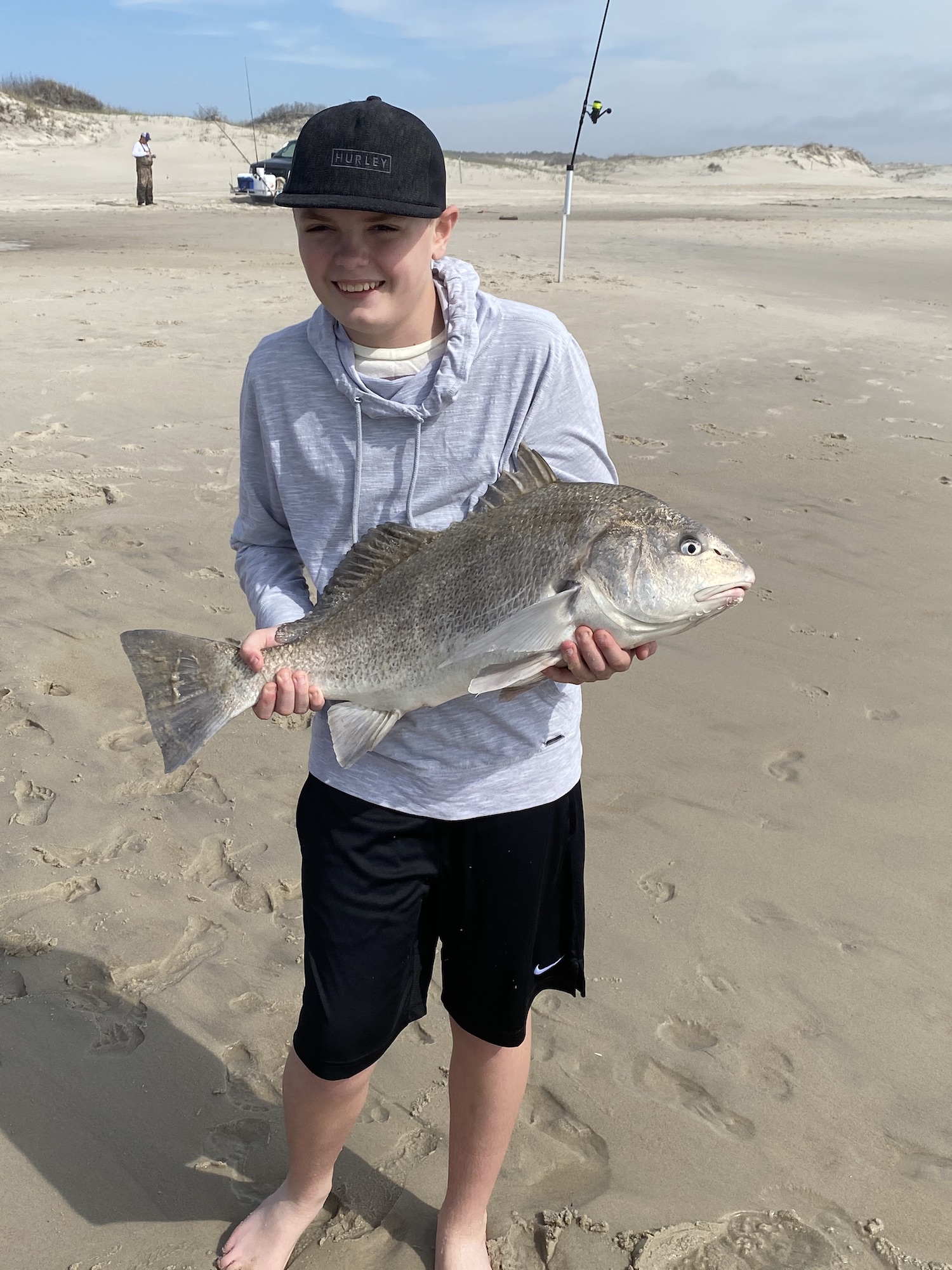 Steve Sweigert, Lee McCabe, Joe Sharkey, and Kaden Herschberger fished the Assateague surf again today and had another terrific day of black drum fishing. Kaden was able to catch his first black drum and the crew totaled seven fish on the trip.
