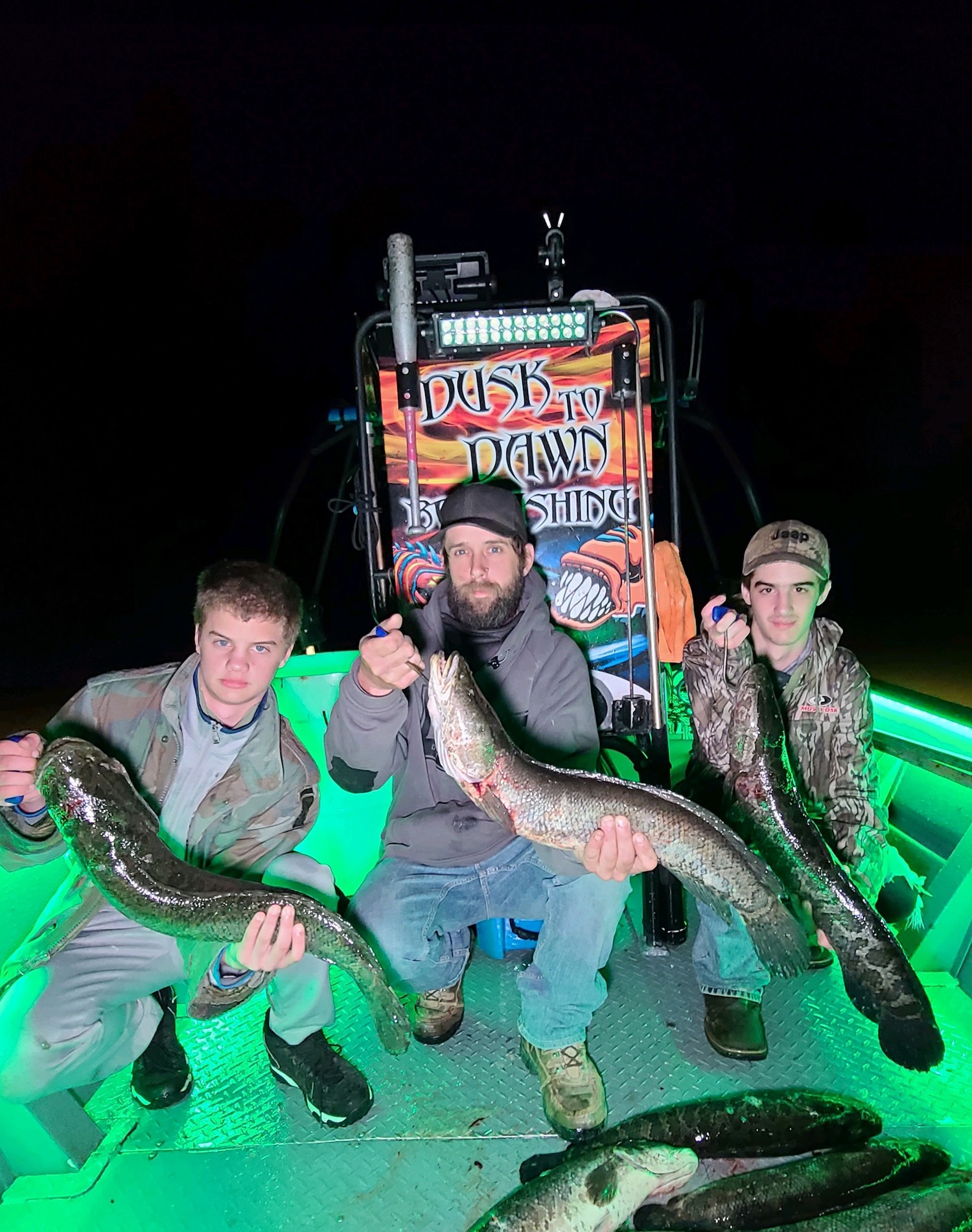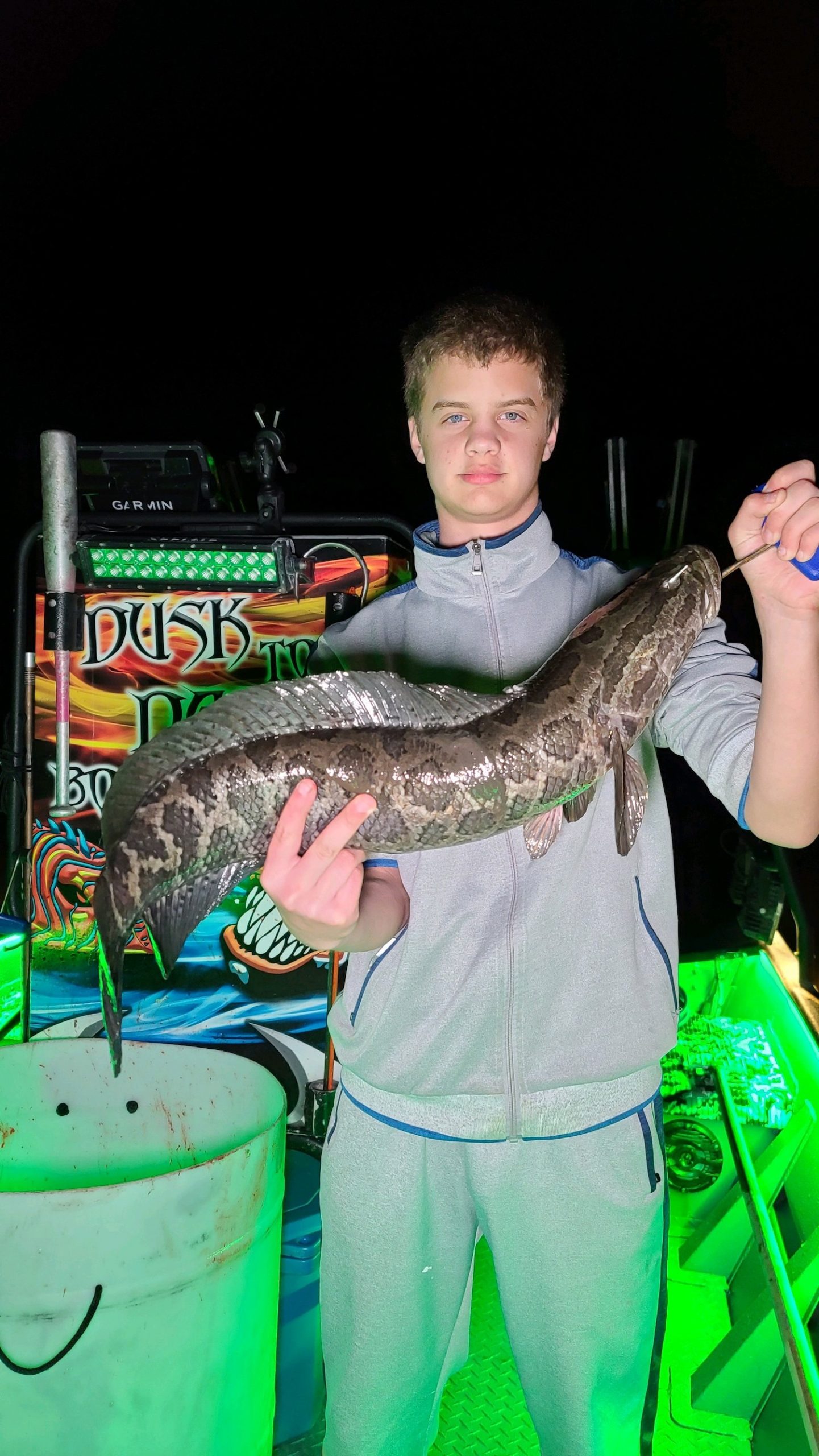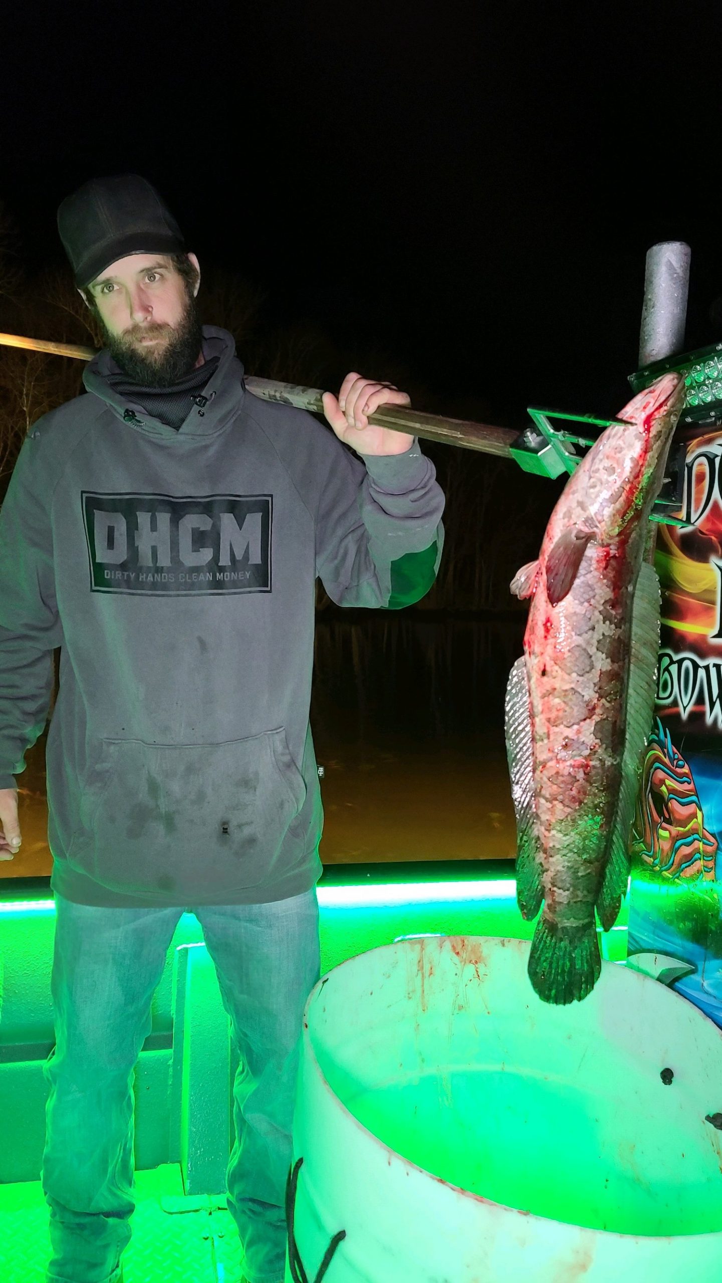 Captain Mark Spagnola of Dusk to Dawn Bowfishing is back on the prowl at night and doing his part to eradicate the snakehead population. Last night was another great night for his shooters with some bonus gar mixed in.