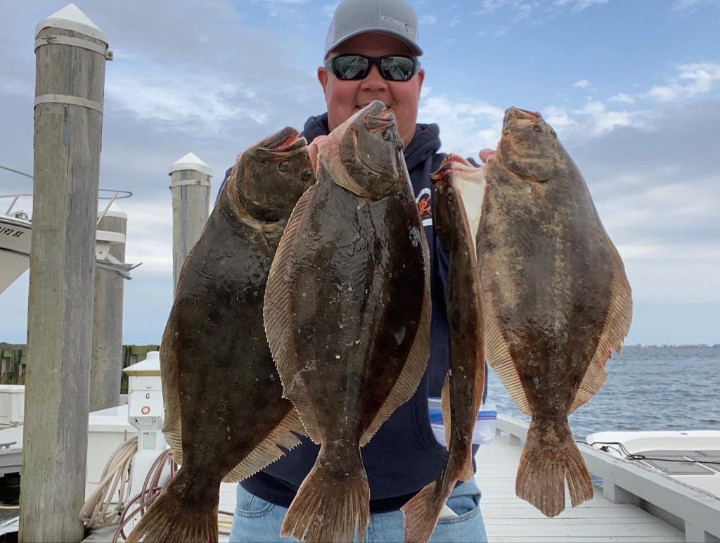 Flounder fishing in Ocean City was pretty good today for some with several keepers ending up in coolers. Donny Post and his buddies Sammy Luzier and Griffin Pualk had a nice day with some tog, rockfish and two keeper flounder. The flounder were 17″ and 19″ and fell for Deadly Doubles baited with minnows.