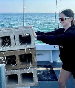 Young Miss Lexi did the deed on today’s reef block drop in fine style. Have been concentrating on Capt. Bob’s Memorial Reef when able and did so today – makes 4,538 reef blocks & 94 pyramids there. (plus a lot of large material! It’ll be {is!} one of our greats..) For the life of the project we have 41,703 reef blocks deployed off my transom and 2,236 reef pyramids alltogether.