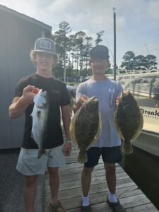 Captain Jason Mumford of Lucky Break Charters had a nice day today with two very successful trips. This afternoon it was bluefish and a couple of keeper flounder (and a bunch of throwbacks), and this morning it was short stripers and a big red drum release.