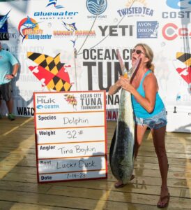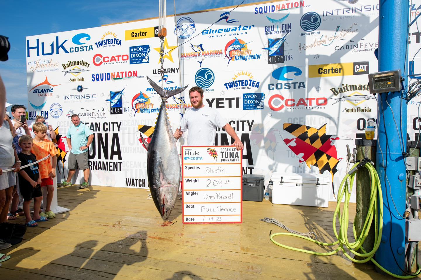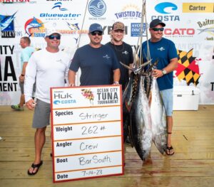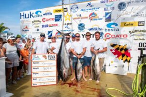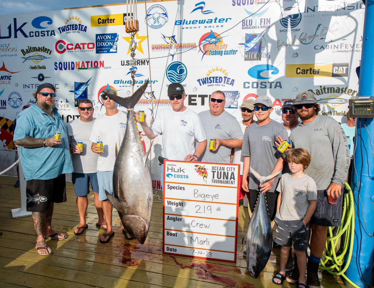 I just got back from a surprisingly busy day of scales action at the Ocean City Fishing Center for day 1 of the OC Tuna Tournament. With only 30something boats fishing today and rough conditions to boot, I really didn’t expect the scales to be as busy as they were. Nonetheless, there were lots of tuna weighed and there were some really nice bigeyes brought to the scales. Here’s who’s leading after the first day of fishing. Thanks to the OC Fishing Center for the pics!