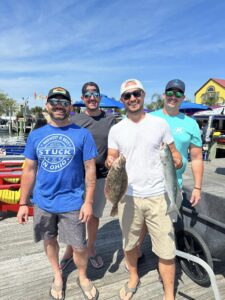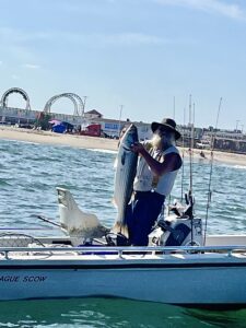 My main man Big Bird Cropper called this afternoon and I could tell he was grinning ear to ear through the telephone. He went on to tell the story of his personal best rockfish that he caught today and it was a great story. Bird was throwing Roy Rigs at the north jetty when his bait was clobbered and drag immediately starting smoking off the real. Waves in the inlet were rolling, and the offshore fleet was coming in making it even more difficult, but after a long, hard fight he got the big rock boatside. Bird netted the fish by himself, gave it a quick measure and held it for a quick pic before holding it in the water until it was lively enough to swim away. The big rockfish was Bird’s personal best at a whopping 55″!! Congratulations buddy!!