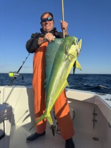 Blair Rinnier sent in this photo of a very nice bull mahi that angler Frank Killian of OC, MD caught today in the Poorman’s Canyon on board the private boat Island Time.