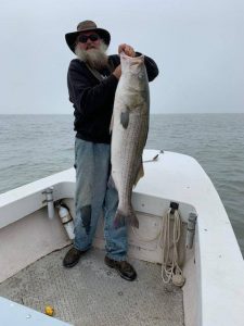 The first text I got today was from my main man Big Bird Cropper with some very exciting news. Bird was fishing outside the south jetty with his buddy Shawn when his lure got hit by something B. I. G. When Bird got the big fish to the boat he realized he had just caught his personal best rockfish on his World Famous Roy Rig. The big rock was 53″ long and I’m betting more than 35 pounds and was quickly released thanks to the fact that our stupid coastal regulations don’t allow fish that big to be kept. The coastal limit for striped bass is from 28″ to less than 35″ so anything over 35″ must be released. Big Bird and Shawn also released another 20 or more smaller rockfish and a bunch of “snapper” bluefish.