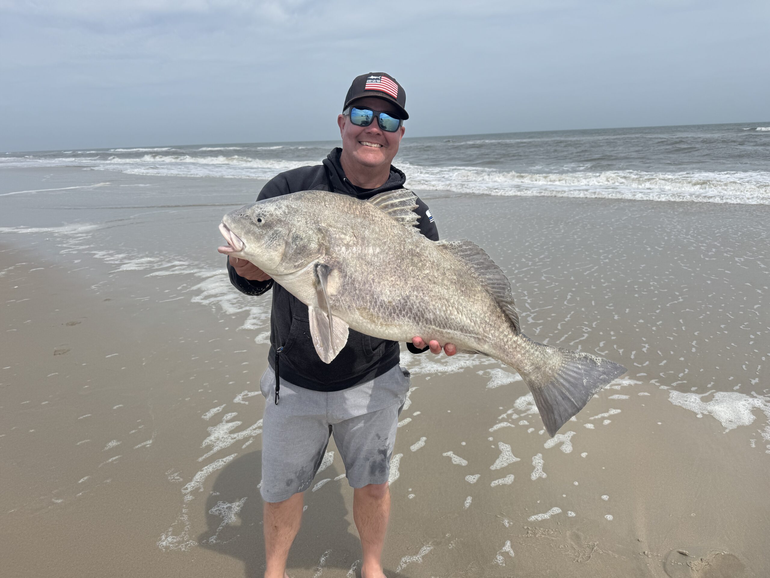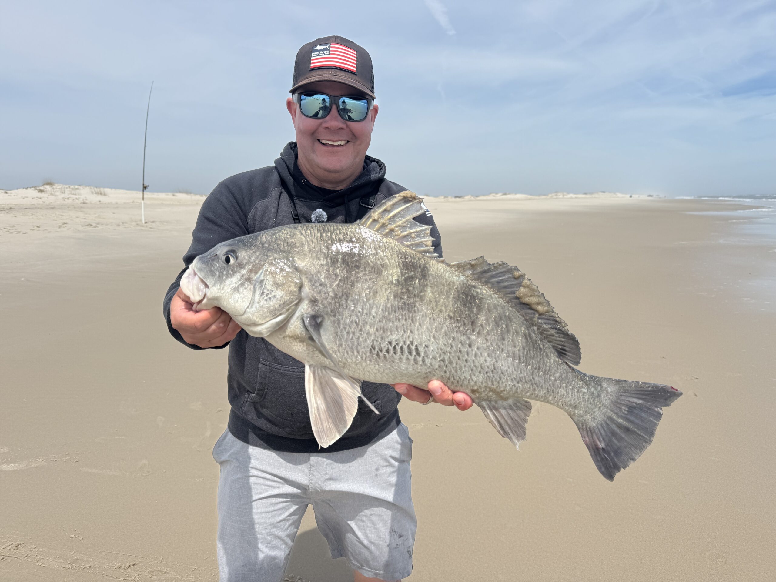It was a warm and beautiful day out there today, and even though the wind got up this afternoon it was a nice day to be on the water…..or in my case, on the beach! I headed down to fish the Assateague surf with my good buddy Officer Mike Dzurnak and we had a great day catching and releasing some black drum. I had two fish of 26″ and 33″ and Mike had a 30″ fish and a big 35.5″er. It was a blast!!