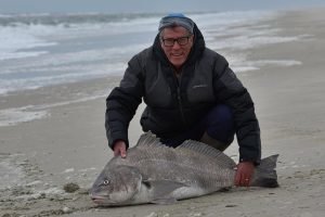 Local surf fisherman Allen Sklar hooked me up with these photos of a couple of big black drum that he and Bill Powell caught in the Assateague surf the other day. Allen and Bill caught and released two “medium” blacks and two “jumbos” including this 43″er. The big ones were estimated at around 50 pounds.