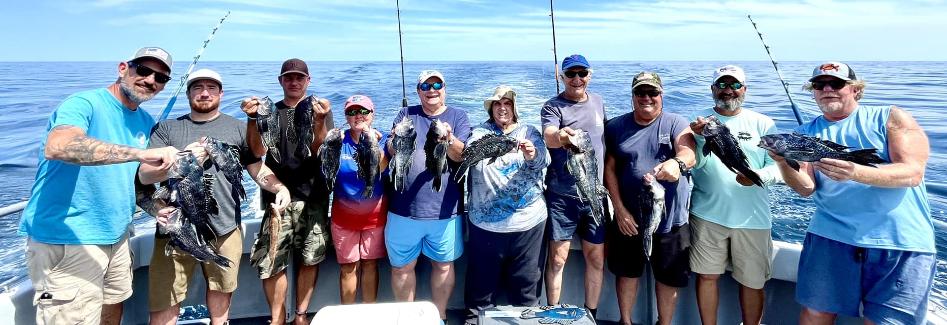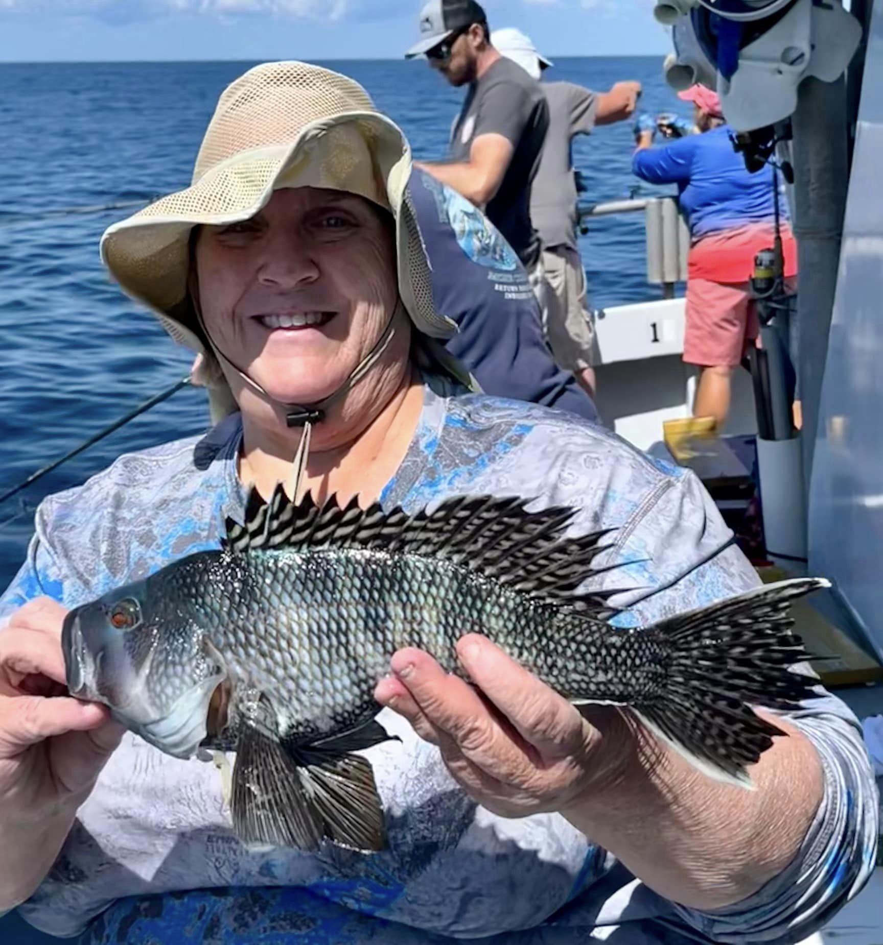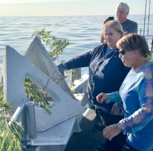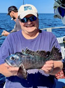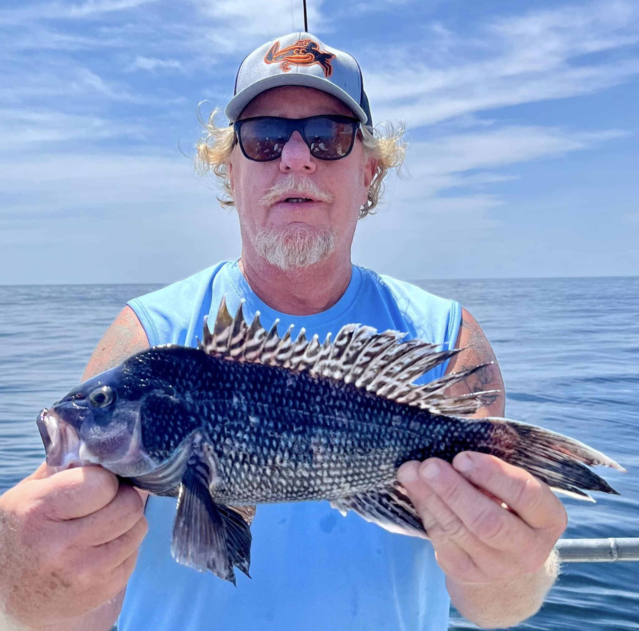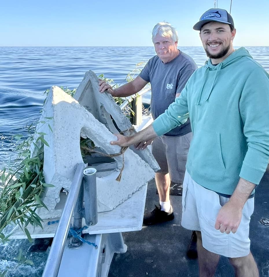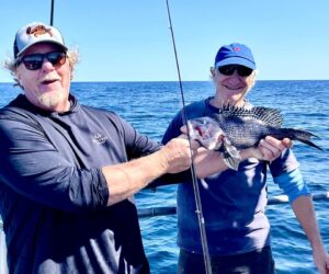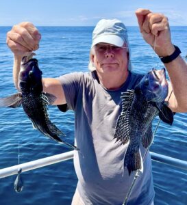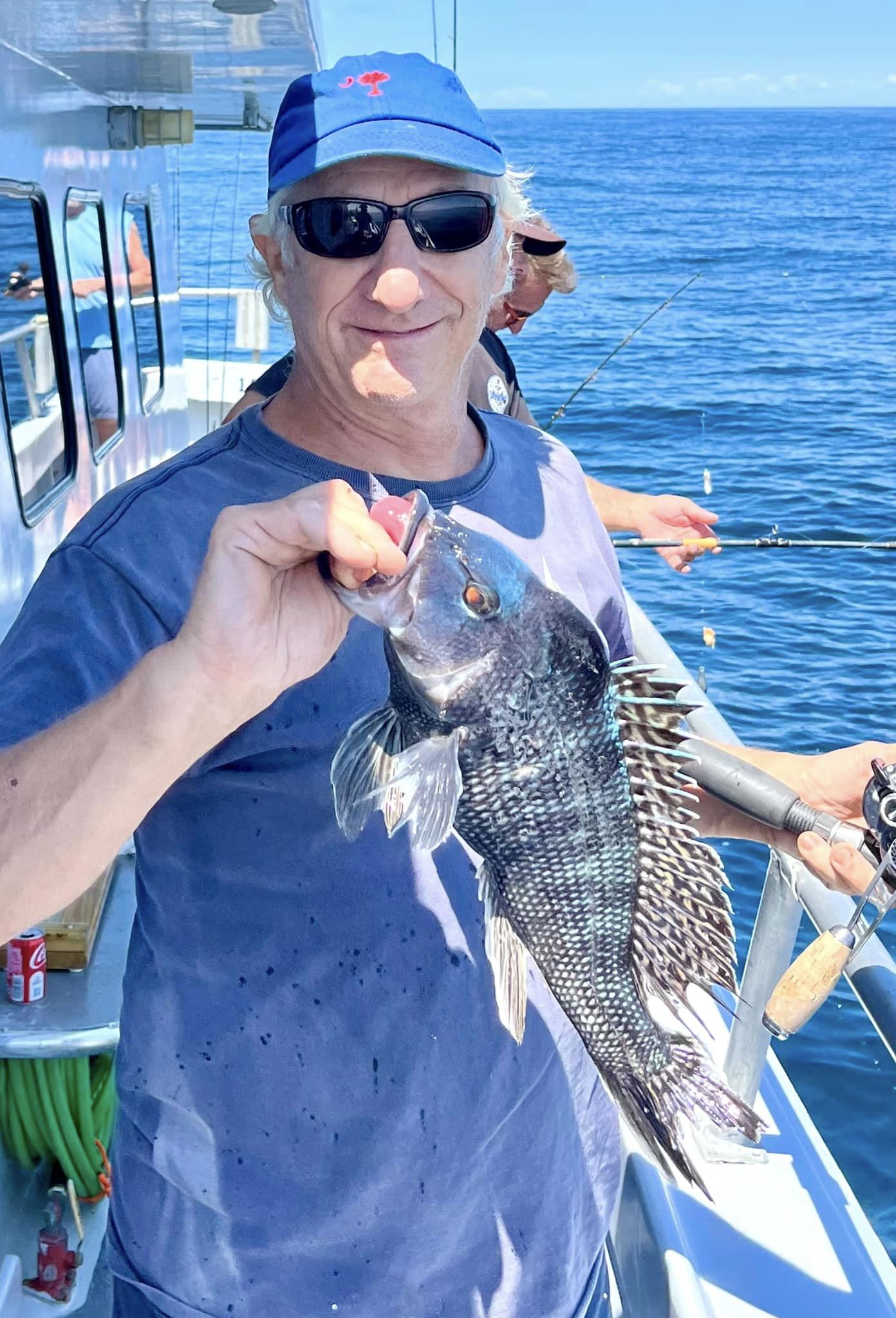 We paused at Capt. Bob Gowar’s Memorial Reef to launch 4 pyramids by the aft rail. Two by Aquarium Jack and nephew Joey; and two pyramids by seemingly gentle ladies from the knitting club ..who are instead the two most sea bass killingest lady anglers you’d ever meet. Ms Holly & Cat-Lady Cathy sent their pyramids to Davey Jones locker in fine style.