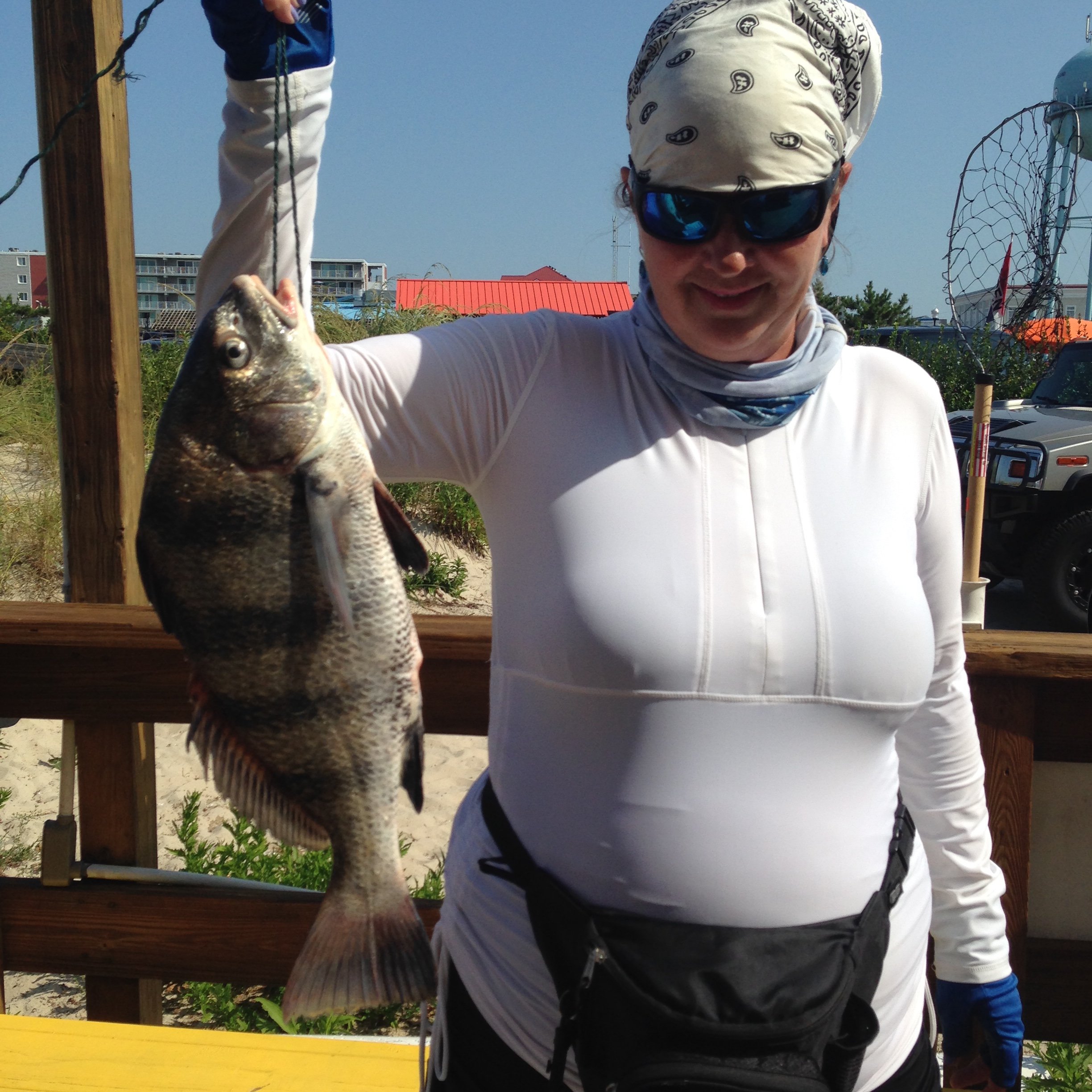 Bear at the Oceanic Pier submitted this photo of Chrissy from Hatfield, PA who caught this nice 20″ black drum from the north sea wall on a sand flea.
