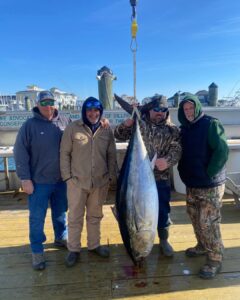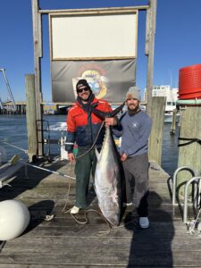 Captain Chase Eberle and his crew on Chasin’ Tides Charters has had two good days of bluefin tuna fishing in a row putting some very nice fish on the dock. Today, Mark an Jordan Dean of Harrisburg, PA landed this beauty of a 67″, 182 pound bluefin and released another “over” fish.