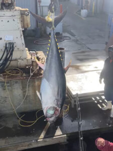 Captain Dale Lisi of Foolish Pleasures is licensed for commercial harvest of bluefin tuna as well so today he and Captain Chris Watkowski of the Spring Mix II harvested this beautiful 82″ bluefin and took it to market.