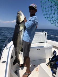 There has been some reely good cobia fishing over the past few weeks and calm days like today have been the best of it. Ayrton “The Kayak Crouton” of Spring Mix II and Jacob Lewis were out on the ocean today and had an awesome day of cobia fishing. The guys used bucktails to catch and release 12 cobia and boat this jumbo 63 pounder.