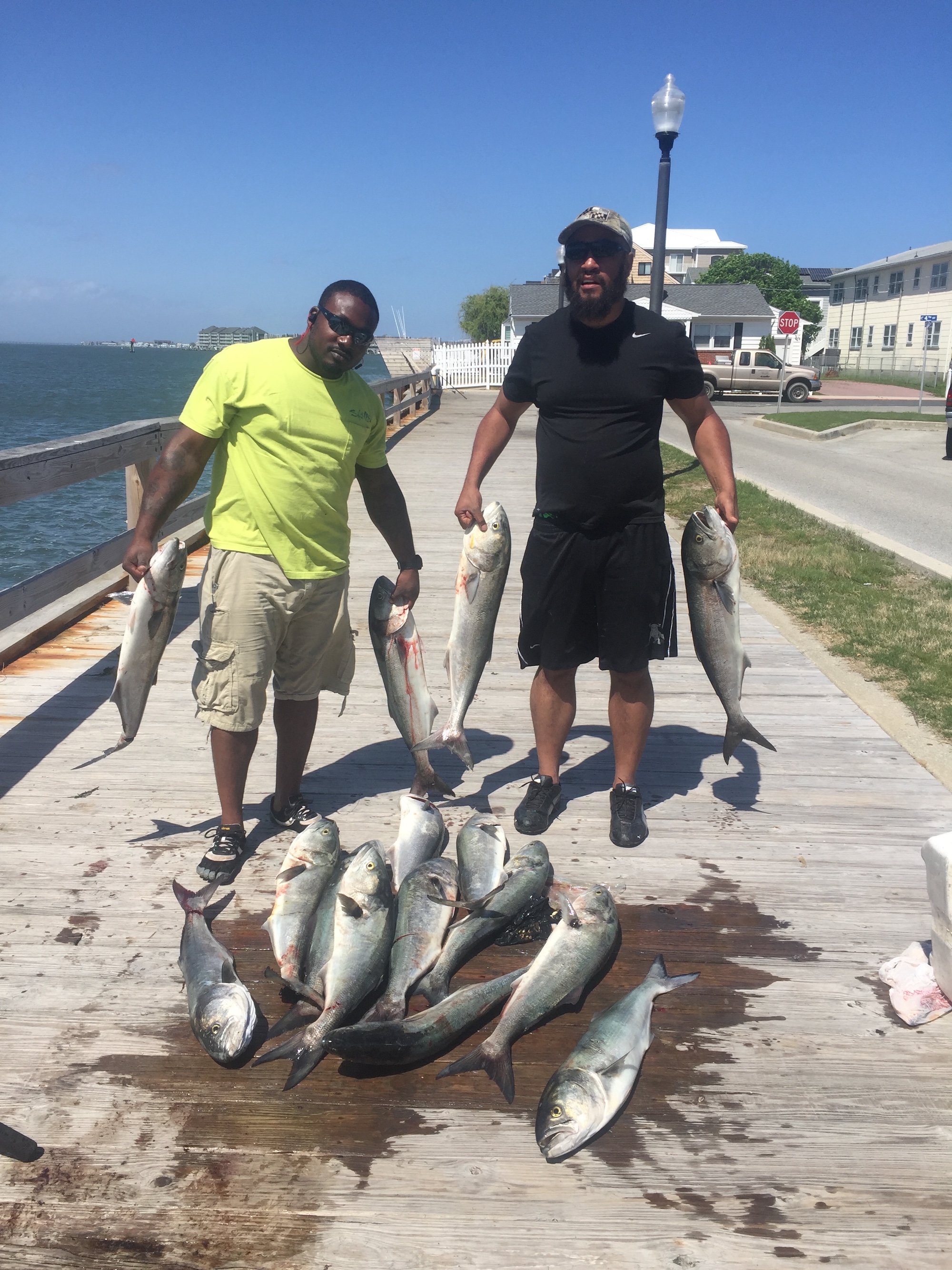 I received a tip from Big Bird Cropper that he saw a couple of guys “killing” the big bluefish along the 3rd street bulkhead behind the baseball fields in downtown Ocean City. I had a few minutes to investigate so I ventured down and met two great guys who had come to Ocean City to do some fishing. Rashad Carr and Lando Norris drove down from Washington D.C. today and absolutely smashed the big blues from the 3rd street bulkhead. The duo combined for 15 bluefish between 30″ and 36″ on cut bait.