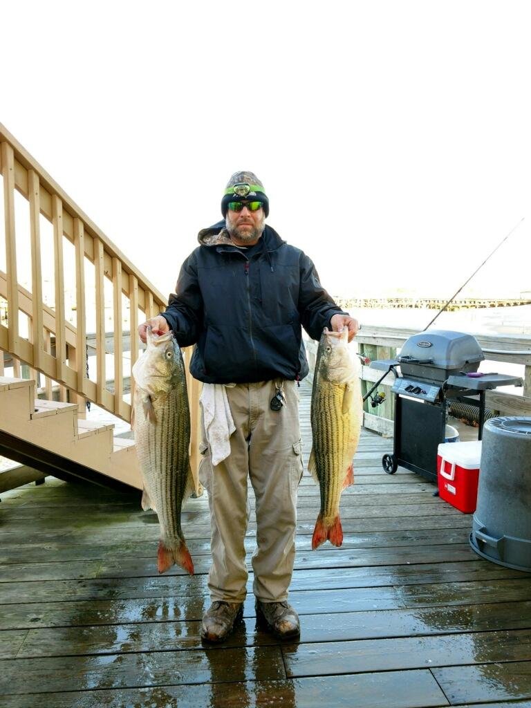 I got these photos from Bear down at the Oceanic Pier this morning who says John from Baltimore was at it again. John caught these two beautiful keeper rockfish from the bulkhead around 1st street on Zoom artificial baits.