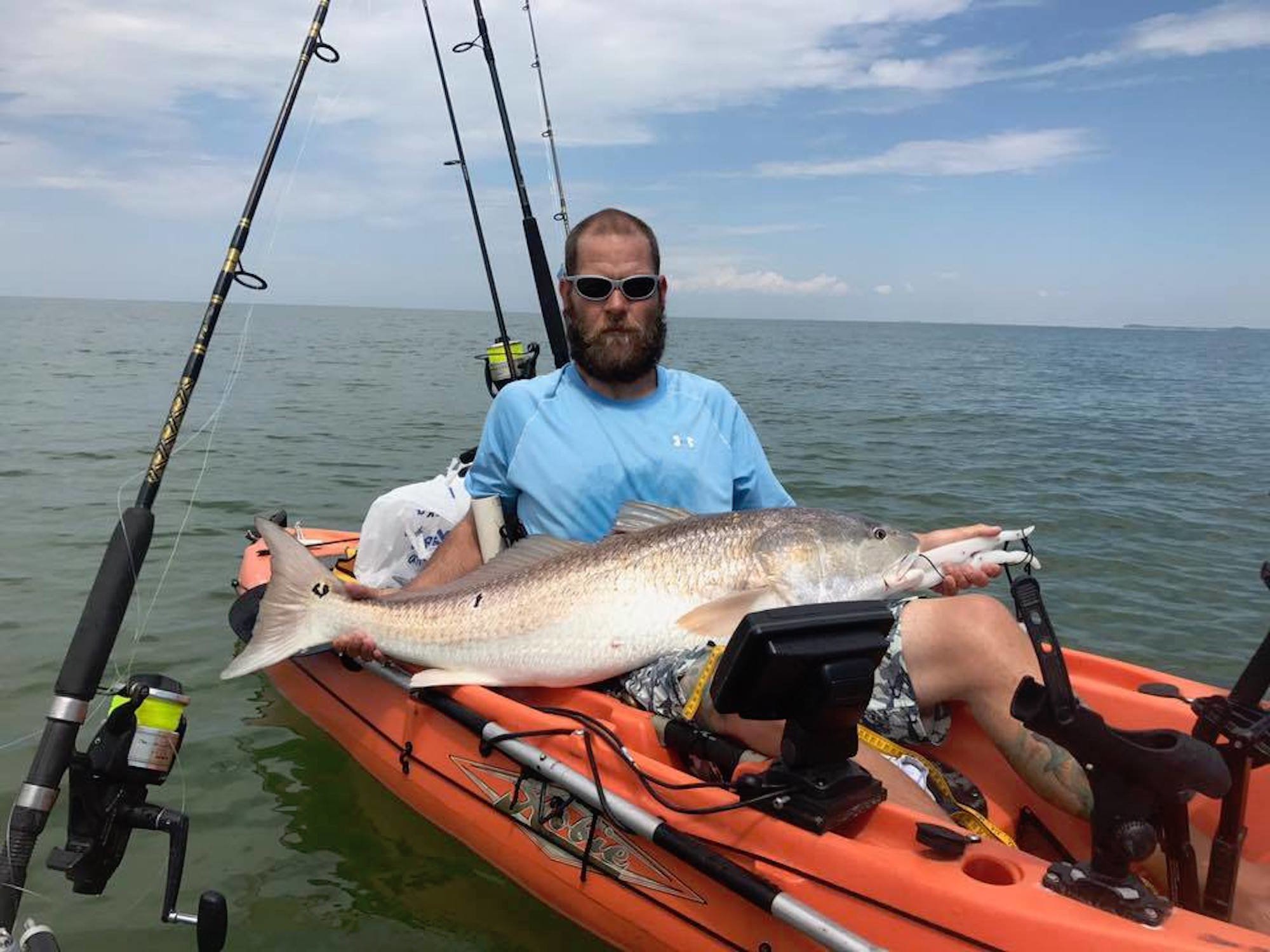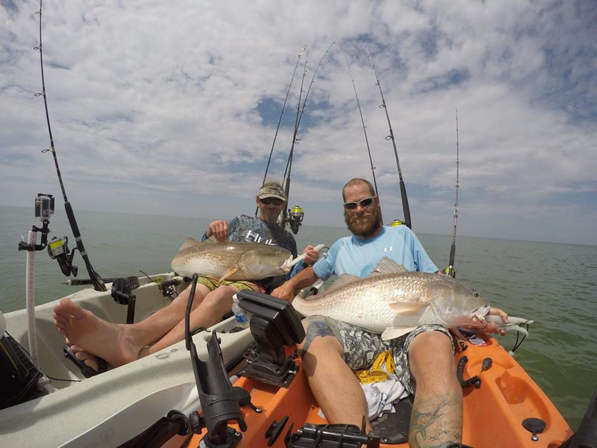 Mike and David Burt of the offshore charter boat Pumpin’ Hard fished the Virginia flats yesterday in their kayaks and had some great luck with a couple of big red drum. The brothers caught and released two 45″ reds while trolling the flats in their kayaks and said that this double were the largest fish that they’ve caught from the “yaks.”