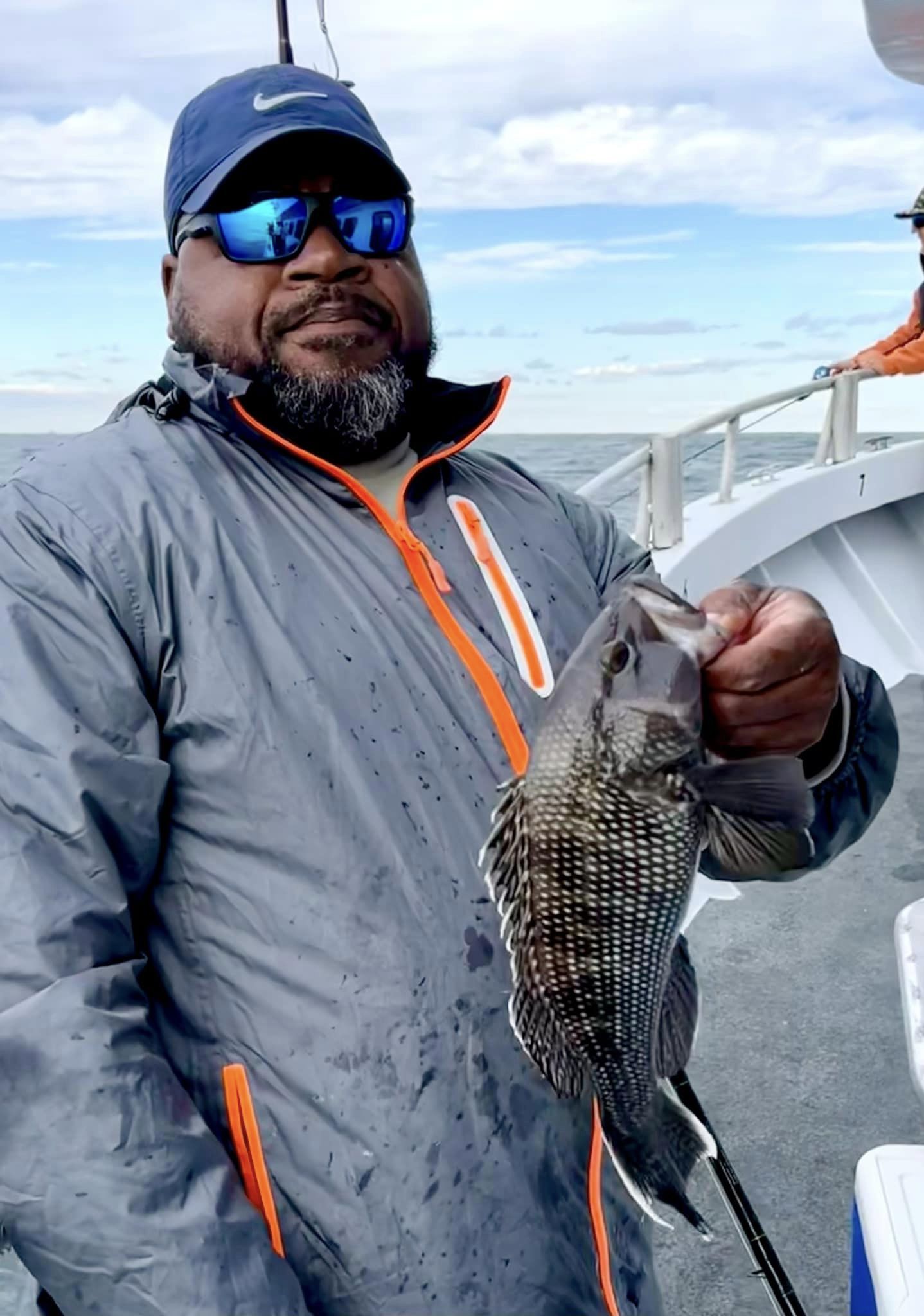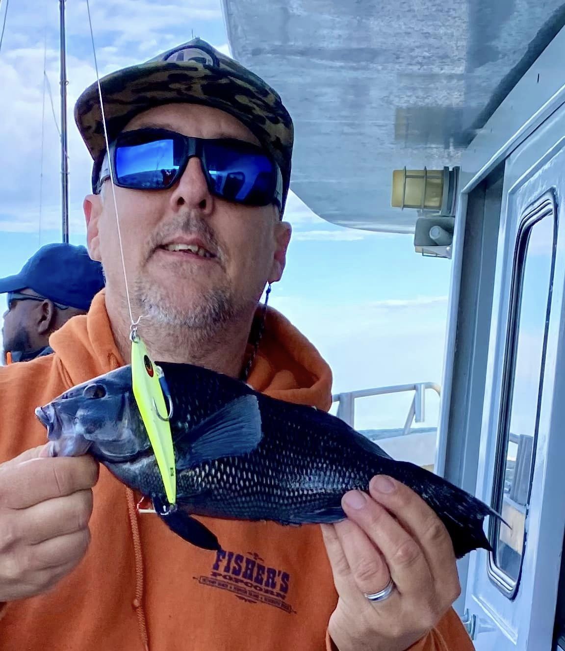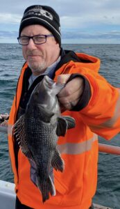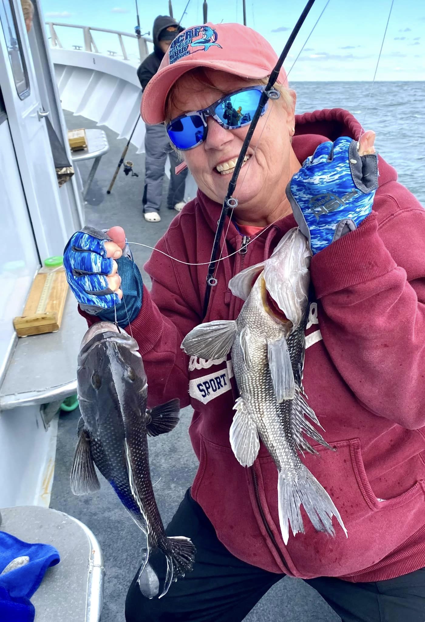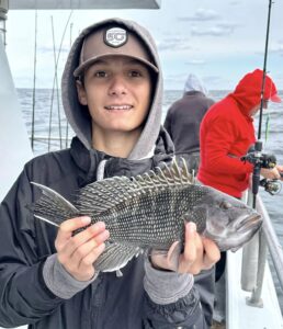 Captain Chris Mizurak of the Angler was stuck inshore today thanks to the wind, but he did still put his anglers on some good fishing with sea bass and a few big red drum that were caught and released.