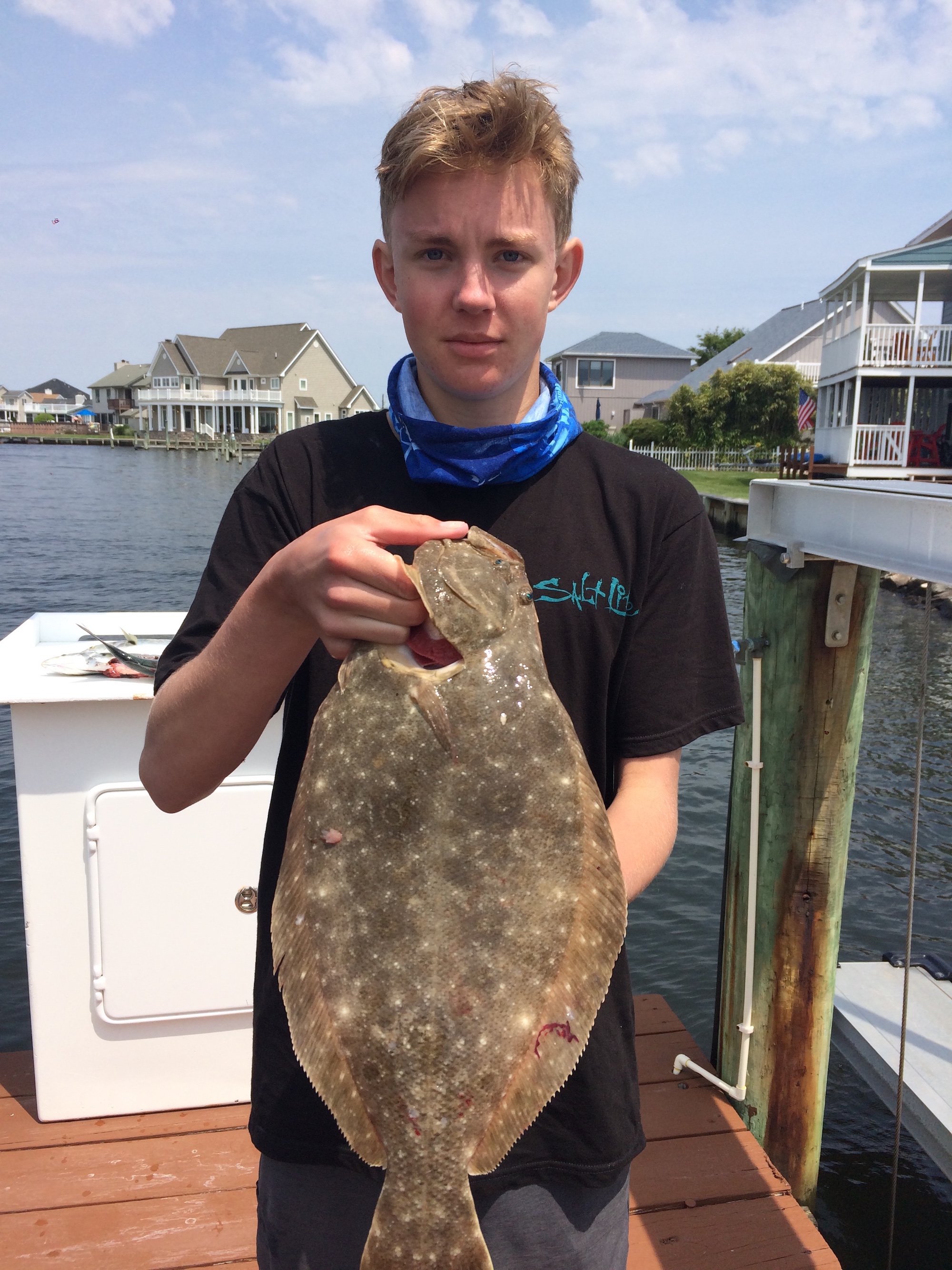 “The Kayak Kid” Ayrton Pryor from the Spring Mix II did a little flounder fishing himself this morning. Ayrton and Jacob Lewis fished the Thorofare with white Gulp and caught three bluefish, two throwback flounder and this nice 20″ keeper.