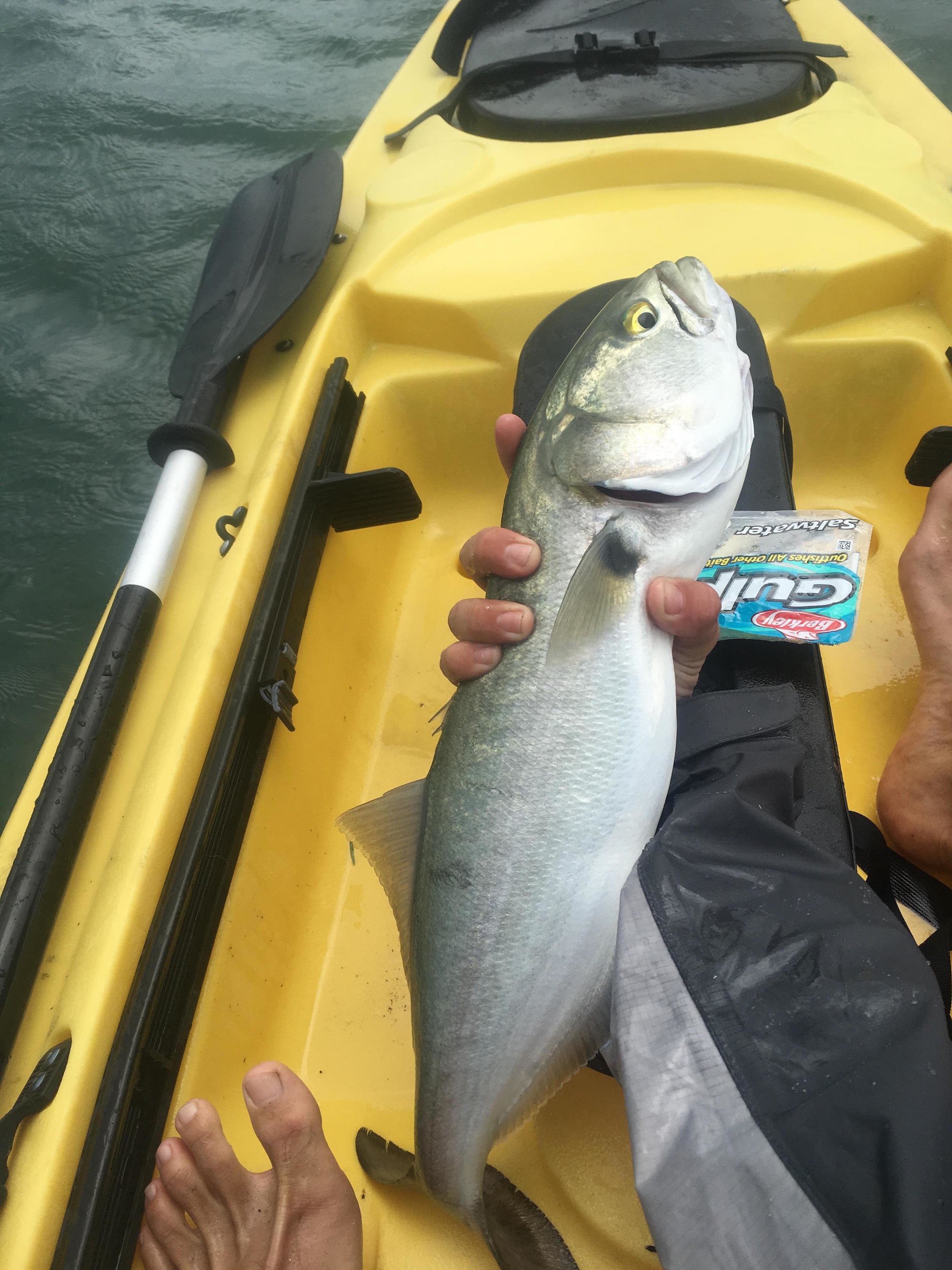 Jeff Hartman was doing some fishing from his kayak in front of Frontier Town where he used jig heads tipped with white Gulp 4″ swimming mullet to catch four bluefish. Watch the toes Jeff!