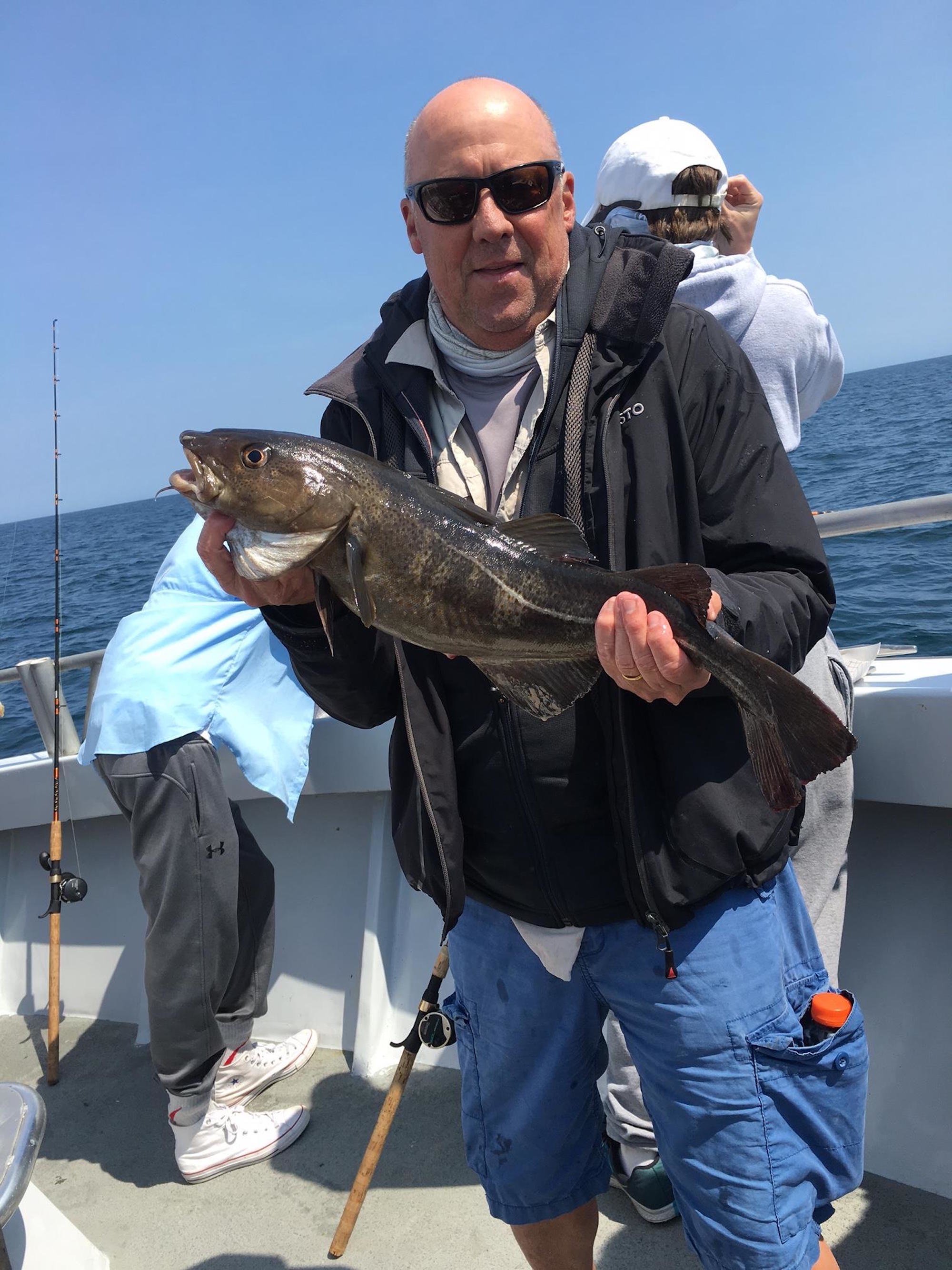 Captain Monty Hawkins of the party boat Morning Star had a good day of fishing the rip today. Morning Star had several sea bass come over the rail and although he was targeting sea bass, Tim Dickson of Alexandria, VA caught this gorgeous 25″ cod on a clam bait.