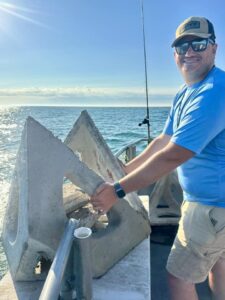 A boatload of regulars, I figured they’d rather fish on one screw than go home. Fish counters Taylor & Constantine did the deed with today’s 4 pyramid drop at Capt. Bob’s Memorial Reef. That makes 4538 blocks & 98 reef pyramids at Bobby’s Reef.