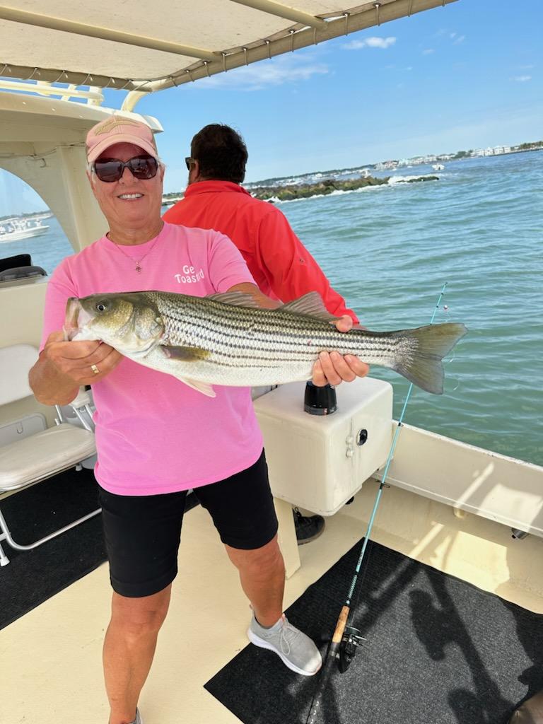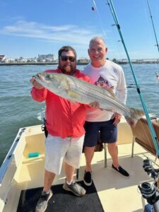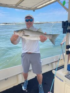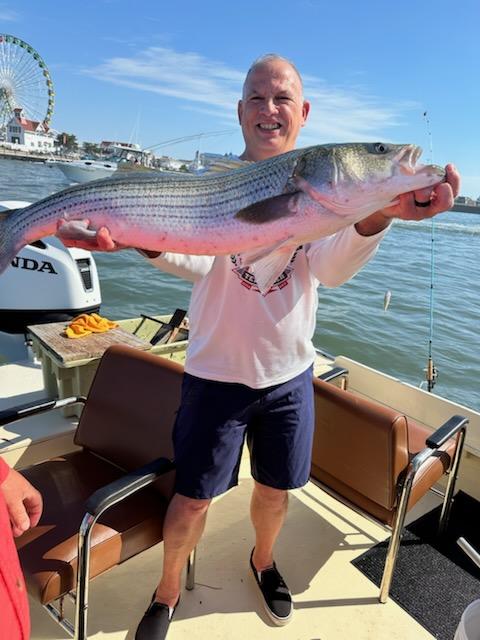 Captain Jason Mumford of Lucky Break Charters had a great couple of trips today. This afternoon Captain Jason found a couple of keeper flounder for his crew, and this morning it was some really, really, really, really, really good rockfishing in the OC inlet. Mark Debinski of Bluewater Advisory Group and his folks had several released striped bass to as big as 37″.
