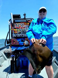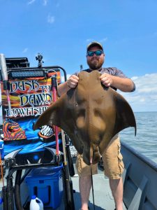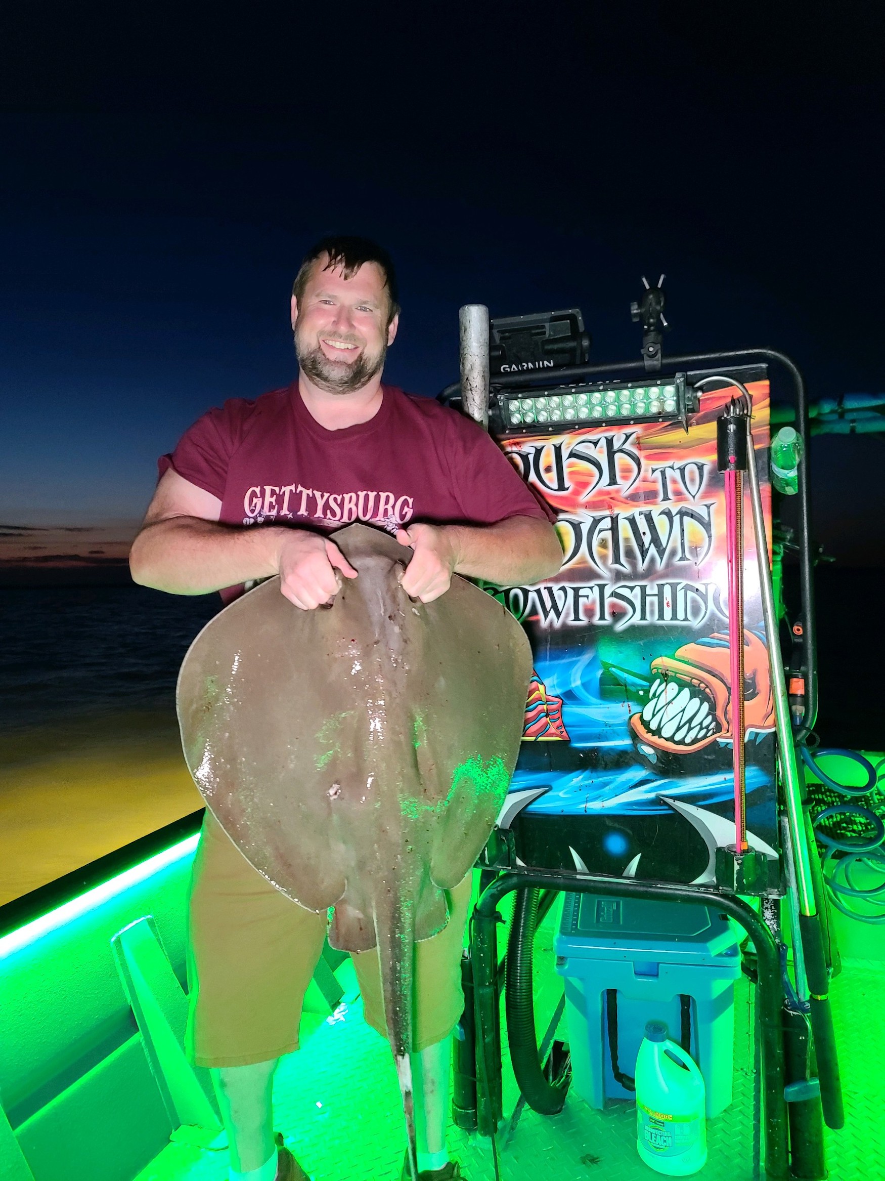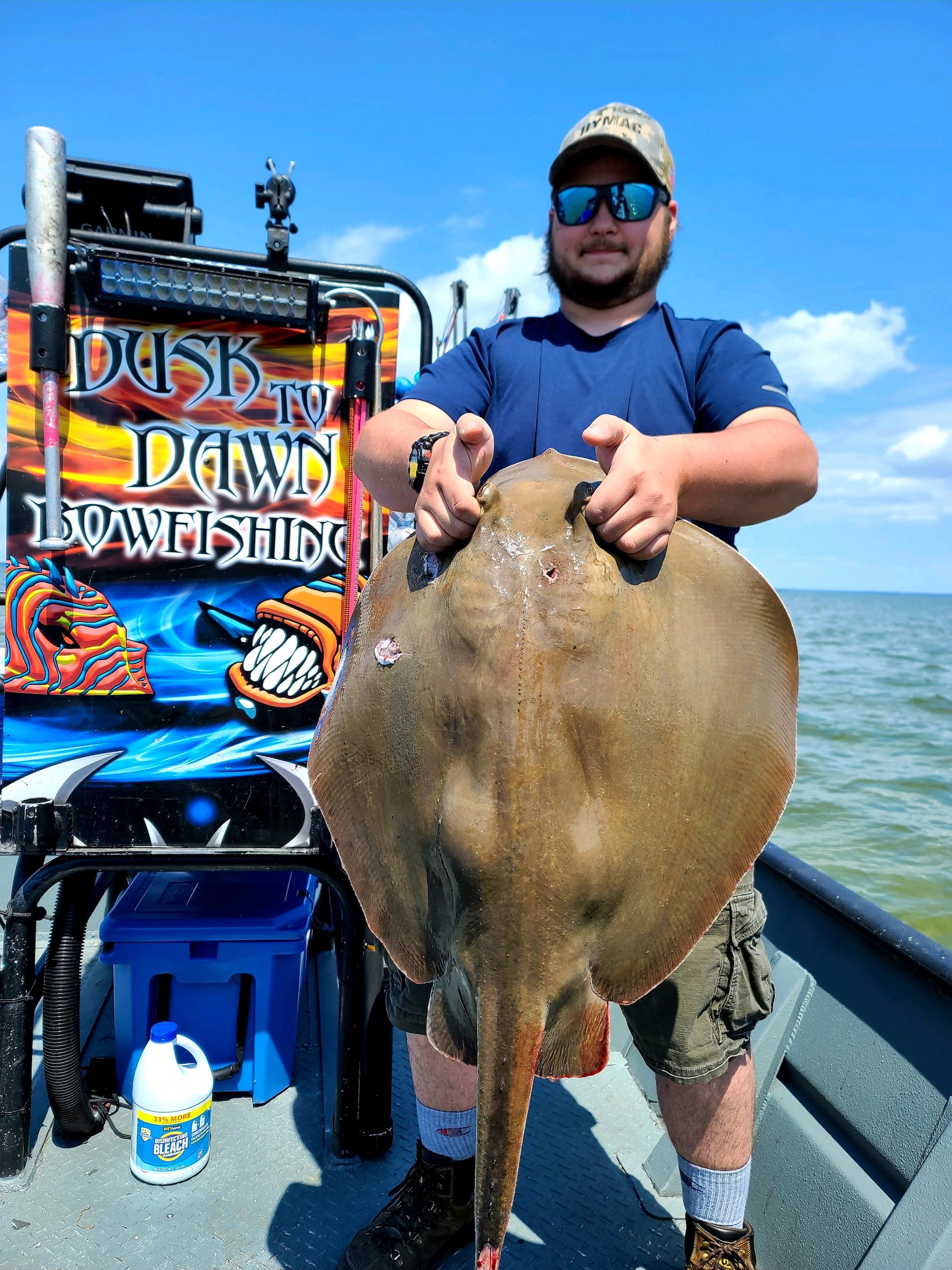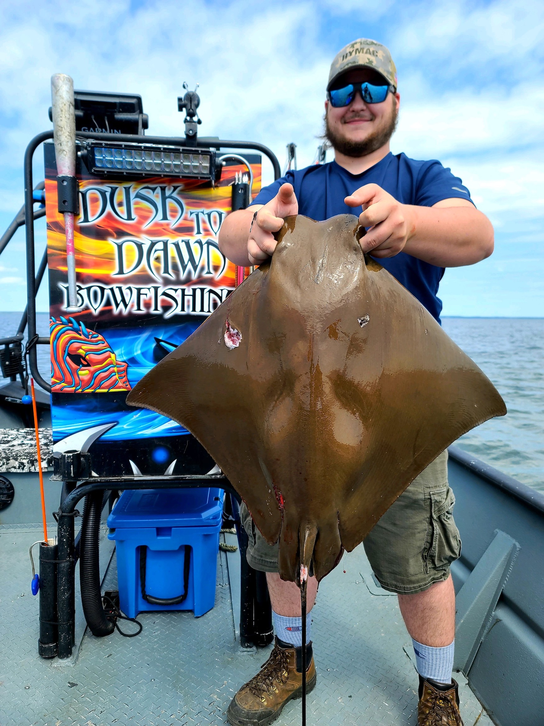Captain Marc Spagnola of Dusk to Dawn Bowfishing is shooting both day and night for his clients and shooting is very good.