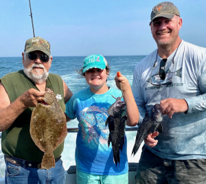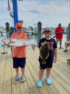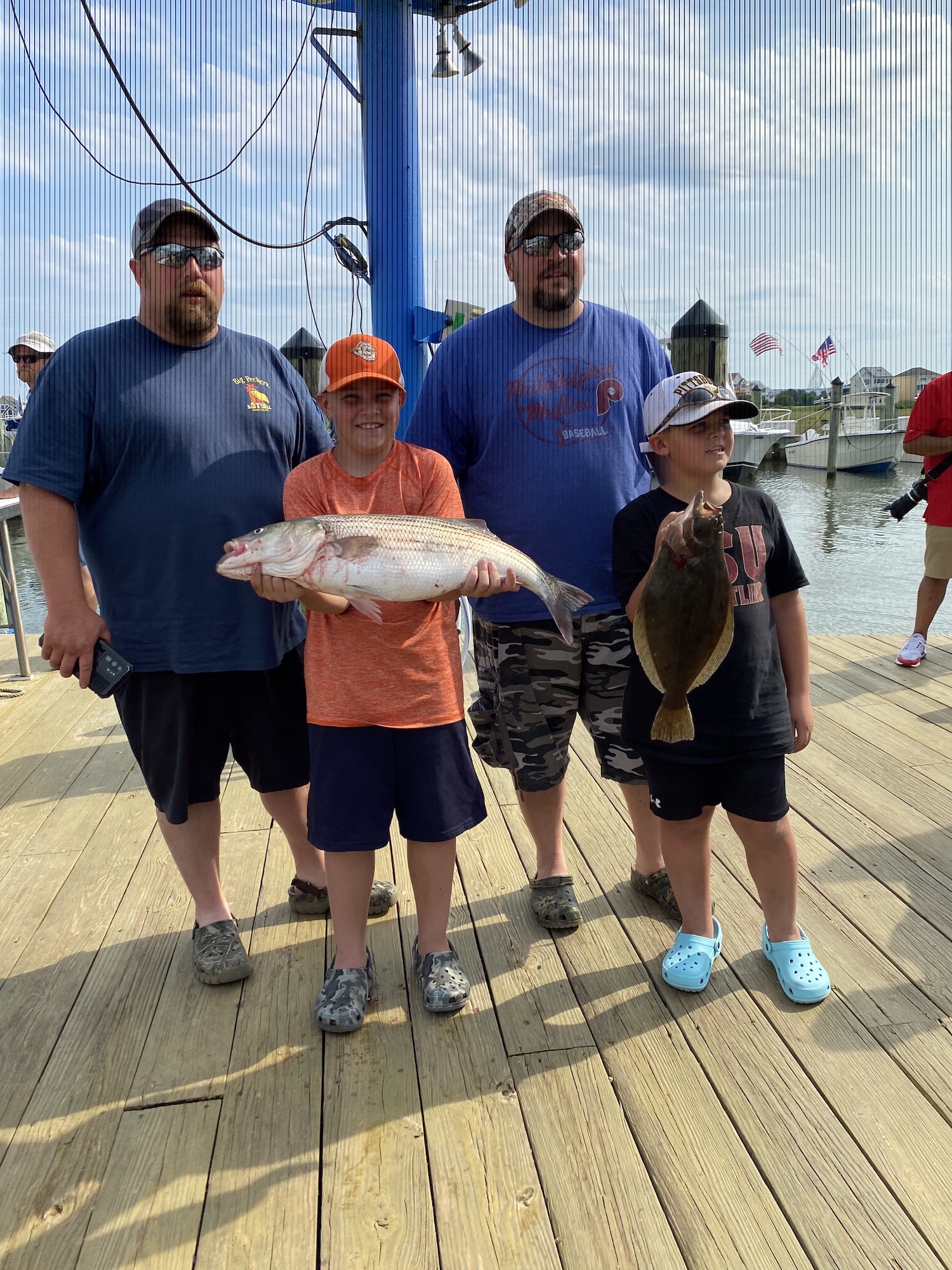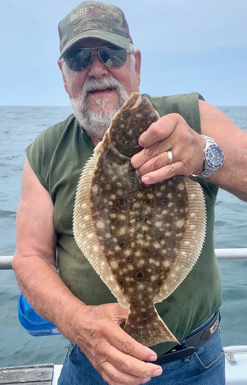 There were way more boats on the water inshore today…most were watching the OC Air Show and some were fishing. Some were doing both. Captain John Prather of Ocean City Guide Service enjoyed the Air Show today and his anglers enjoyed some good fishing with this keeper rockfish and keeper flounder.
