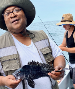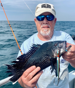 Sea bass were right fussy but worth the effort. Come 2:30 Zig’s young granddaughter & today’s guest reef builder, Olivia, was in double digits. By 3:30 she was limited—right behind her PawPaw (Zig) and very much of her own doing (except taking them off the hook. That was ikky.)