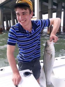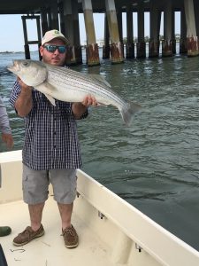 Captain Jason Mumford of Lucky Break put this angler on a rockfish that was too big to keep today while fishing the route 50 bridge. This 37″er was fun fight, but thanks to our stupid regulations it was 2″ too long to be able to keep. Rockfish regs for MD are 1 fish per person from 28″ to less than 35″.