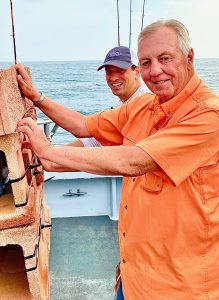Grandpa Bill, (sometimes from Mechanicsburgh PA/sometimes local,) and Kurt M of West Chester PA dropped our reef blocks atop Al Berger’s Reef in bullseye fashion. We pressed on.