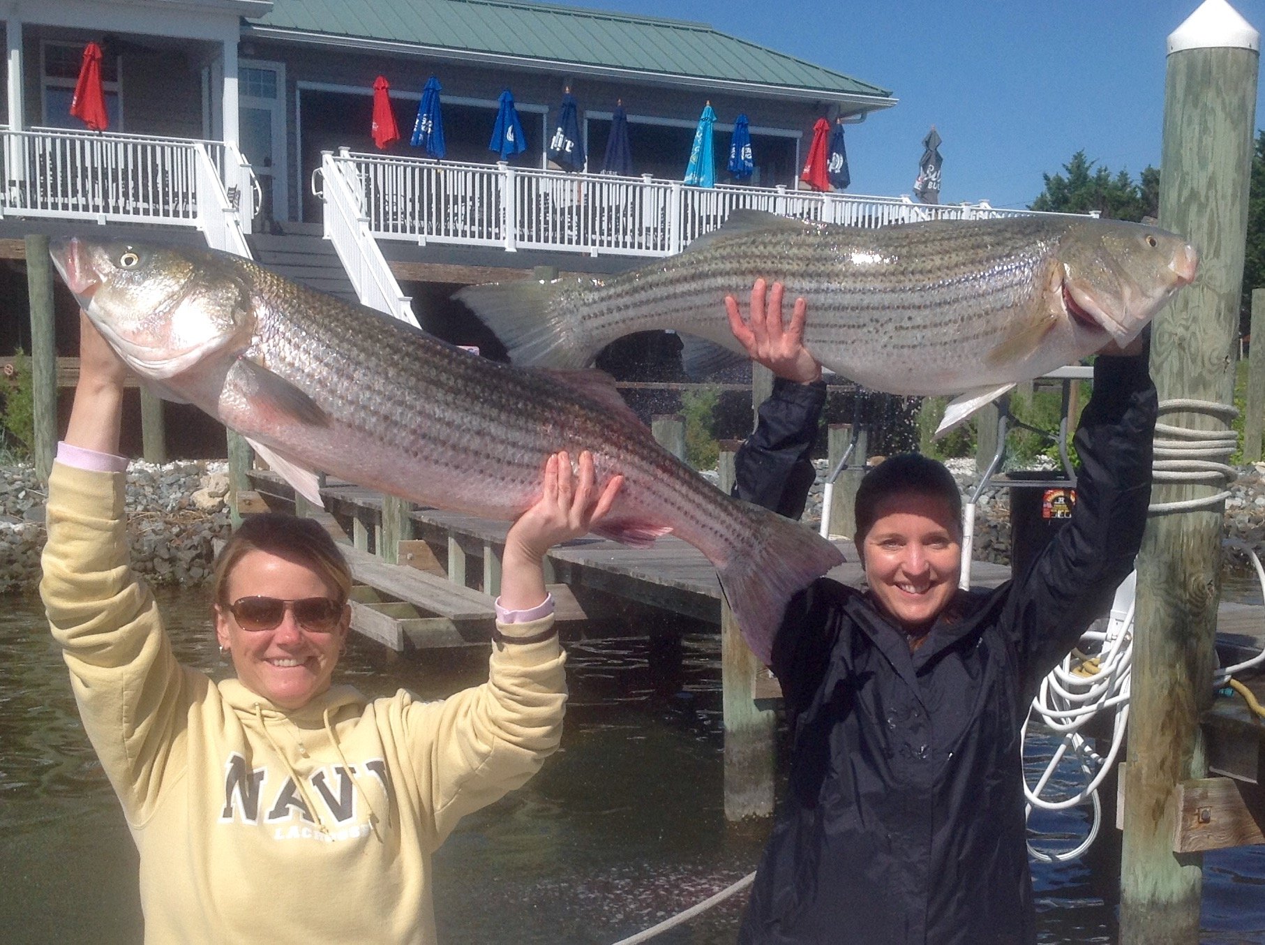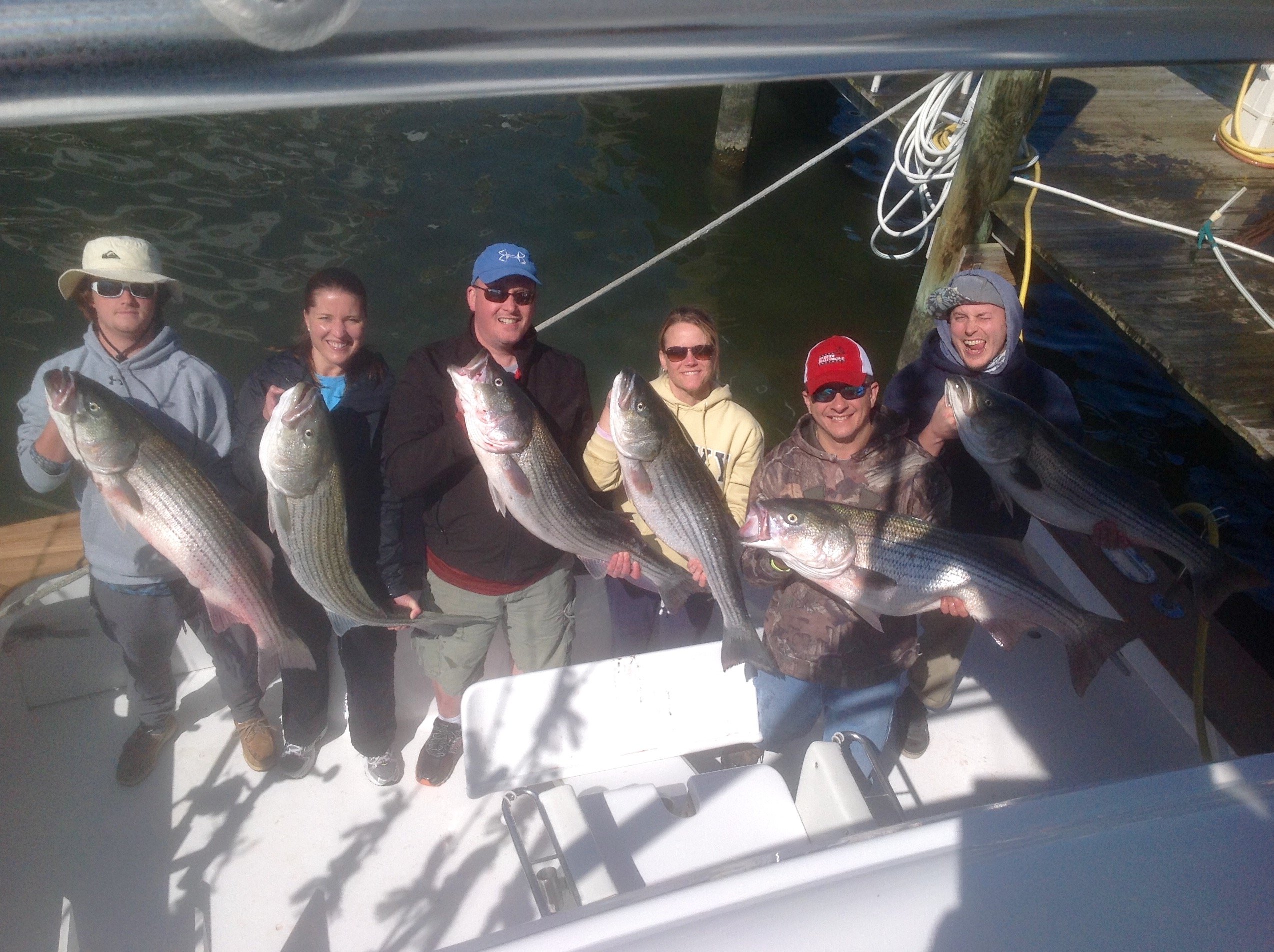 Tracy Gurry, Teresa Eder and their crew had a banner day on the charter boat MARLI with Captain Mark Hoos and Mate Mark Stephens fishing in Solomons, Maryland today. They boated their limit of spring trophy stripers and made it back to the dock in time to enjoy breakfast. Captain Mark reports that fishing is HOT right now!!