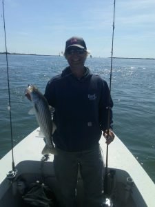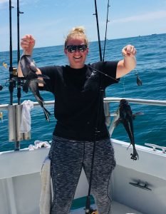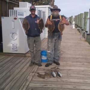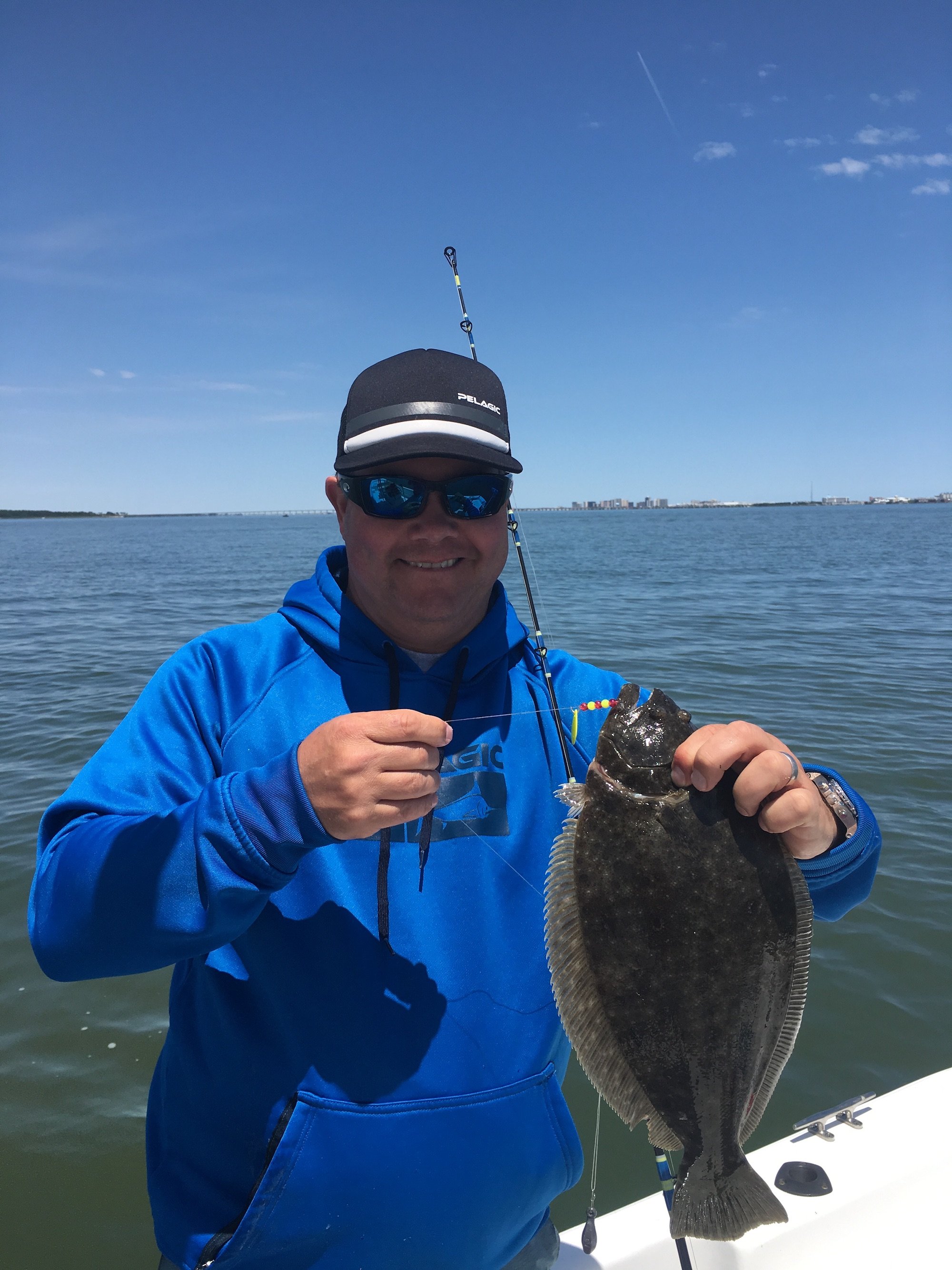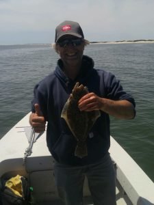 As I mentioned at the top my wife Kristen and I were able to get out for a few hours today after cooking segments at Harborside Bar and Grill for Hooked on OC. We were limited on time because we have a kid to pick up from school, but we were still able to catch a couple of fish. She let me catch the keeper this time when a 17 1/4″ flattie ate my Fish in OC Dale Timmons Deadly Double with a white Gulp.