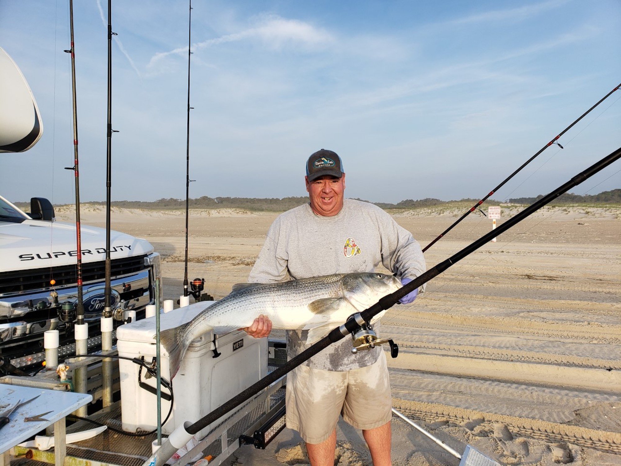 I got an email from Ron Humphress of Berlin, MD today with a photo of a JUMBO rockfish that he caught in the Assateague surf. The big striper was 48″ long and took a Fishbites.