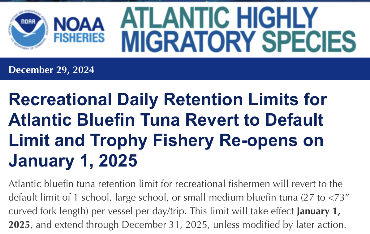 NOAA Fisheries finally announced that bluefin tuna retention limits for recreational anglers will revert to one (1) fish per vessel per day/trip starting on January 1, 2025.  The giant bluefin season for fish over 73″ will also reopen on this date.  This means that all recreational anglers, including charters will be allowed to harvest just one fish between 27″ and 73″ after the first of the year.  Here is a shot of the notice to permit holders from NOAA.