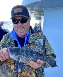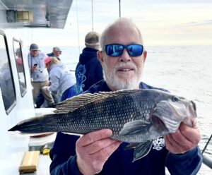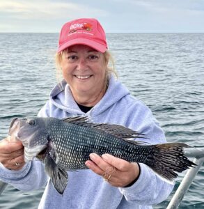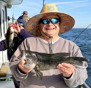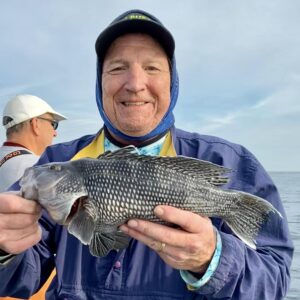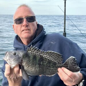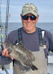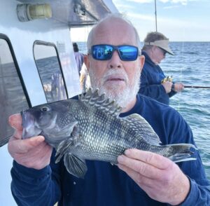 While we were fishing the inlet we saw Captain Jason Mumford of Lucky Break Charters fishing the rocks of the jetty where he had a good time putting this angler on some nice keeper tautog.